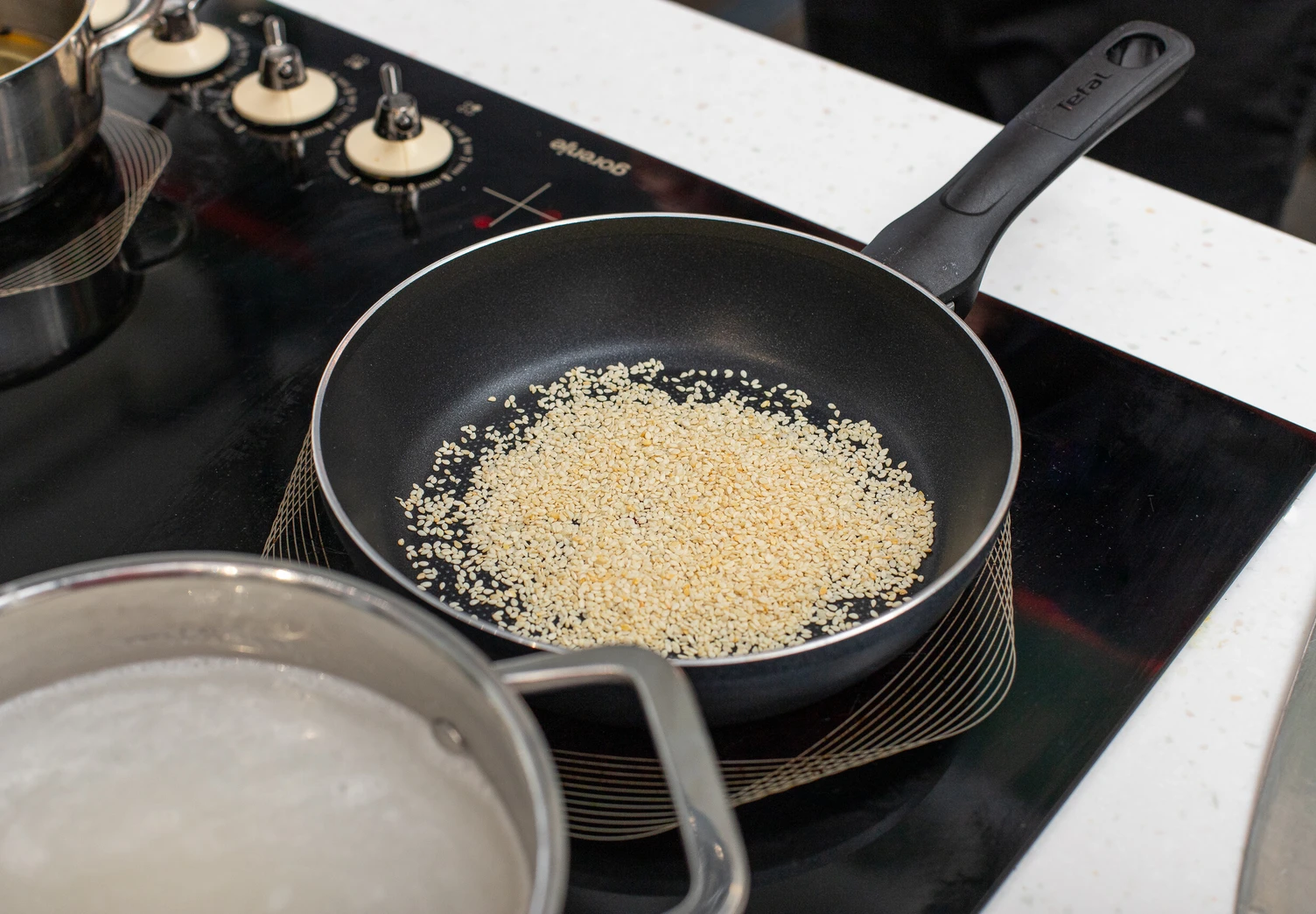 Обжарьте семена кунжута на сухой сковороде до золотистого цвета.