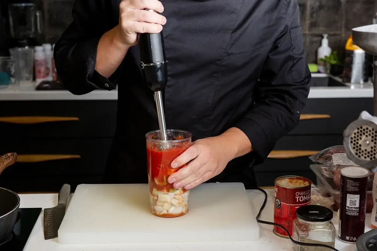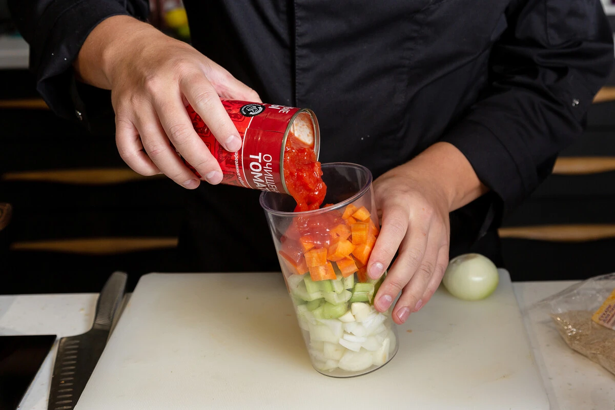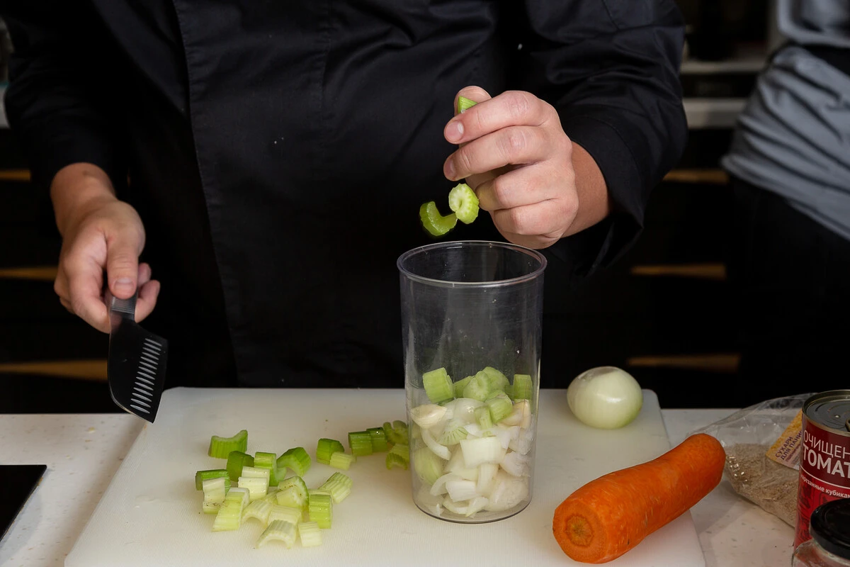 Сделайте подливу. Лук и чеснок почистите и нарежьте крупно. Стебли сельдерея нарежьте ломтиками толщиной примерно 1-2 см. Положите всё в чашу или стакан блендера.