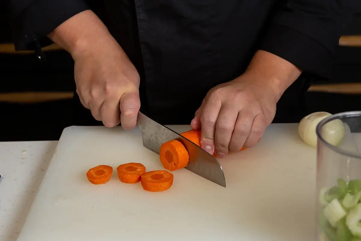 Морковь почистите, нарежьте шайбами толщиной примерно 1 см, а затем четвертинками.
