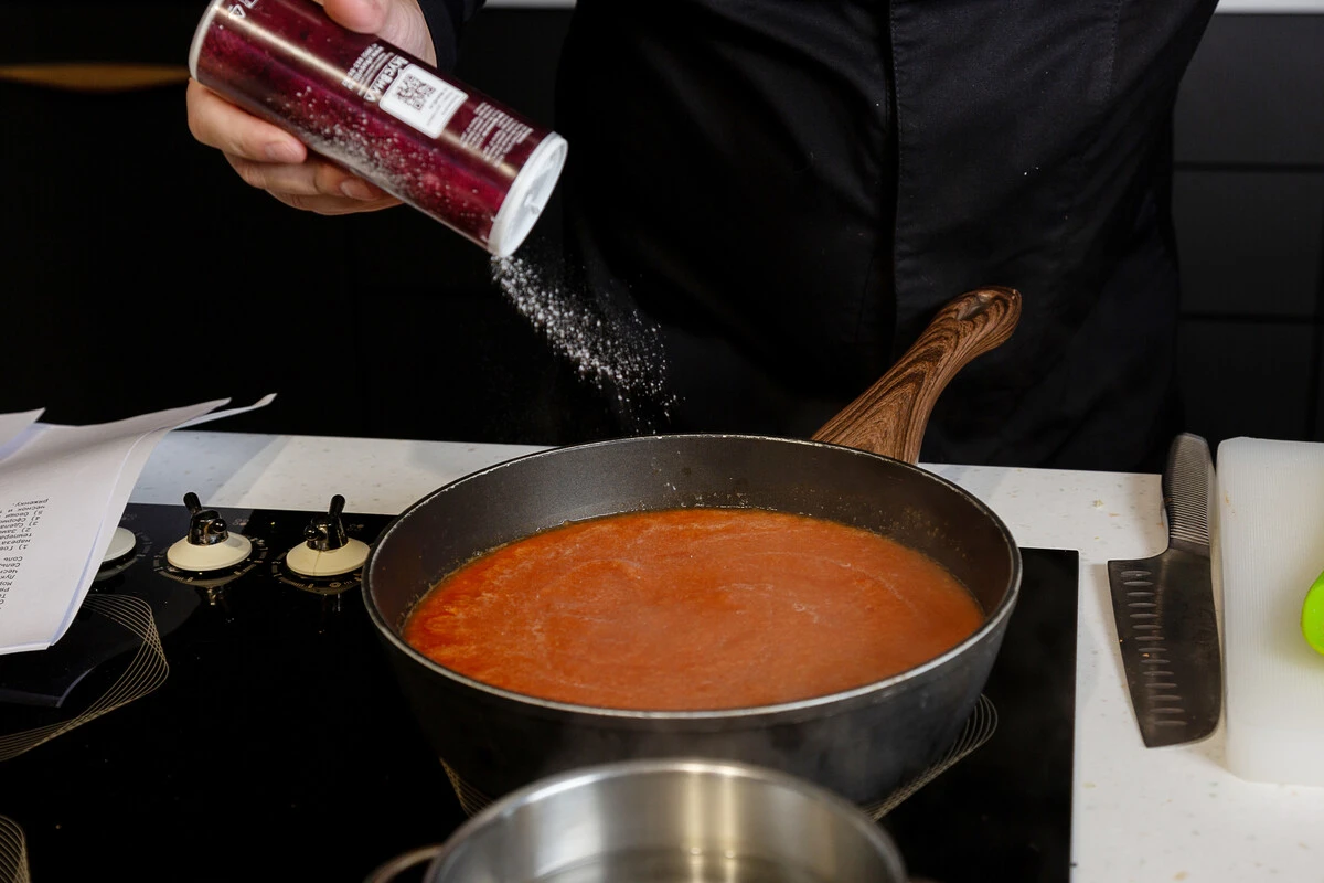 Переложите получившуюся подливу в сотейник или кастрюлю. Добавьте ¼ ч. л. соли, ¼ ч. л. чёрного молотого перца, перемешайте и тушите примерно 10 минут. Крышкой накрывать не нужно.