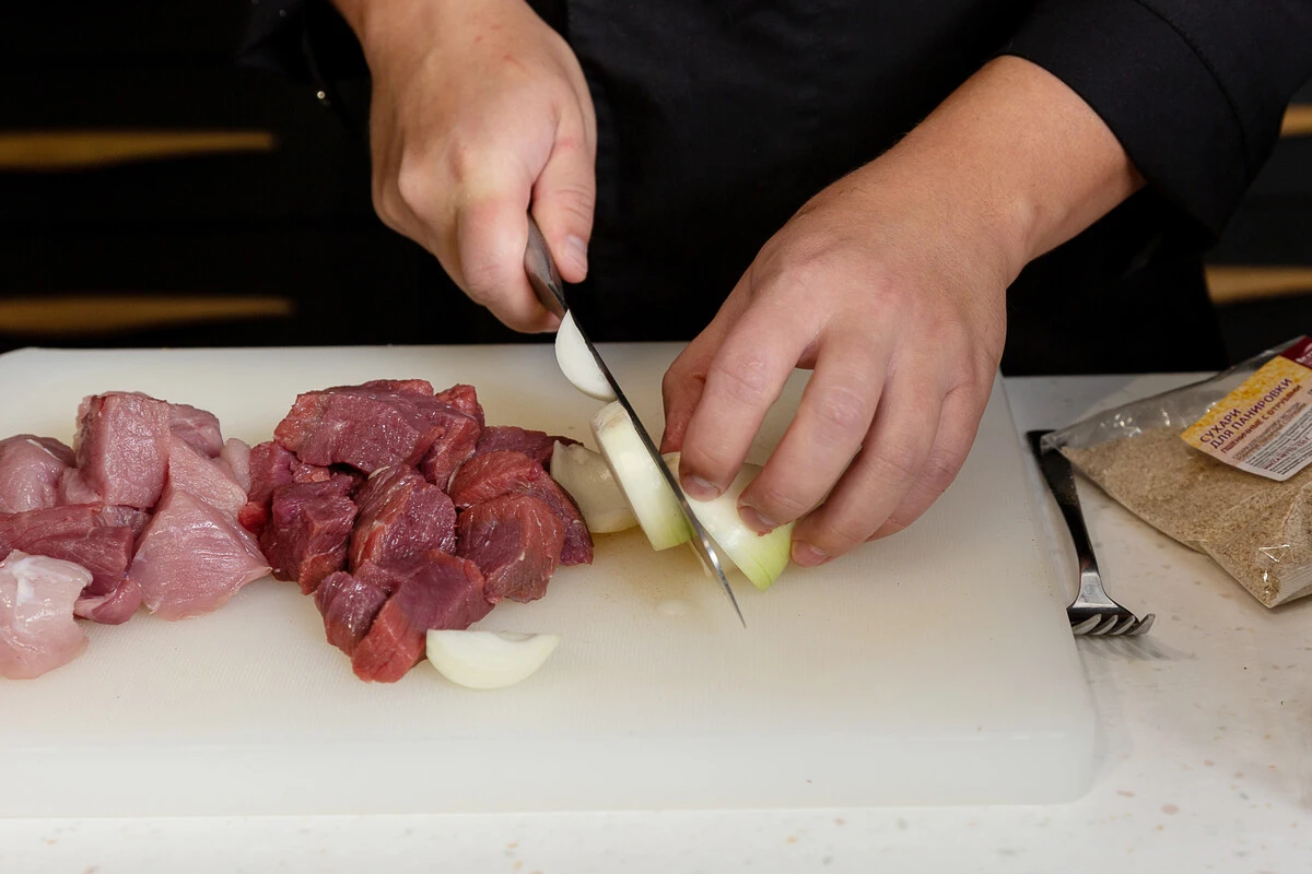 Мясо очистите от жил, если есть, и нарежьте крупными кубиками. Одну луковицу также нарежьте крупно.