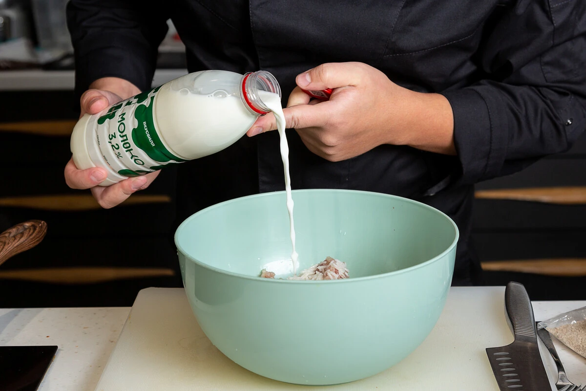 Добавьте варёный рис, молоко и яйцо. Насыпьте панировочные сухари.