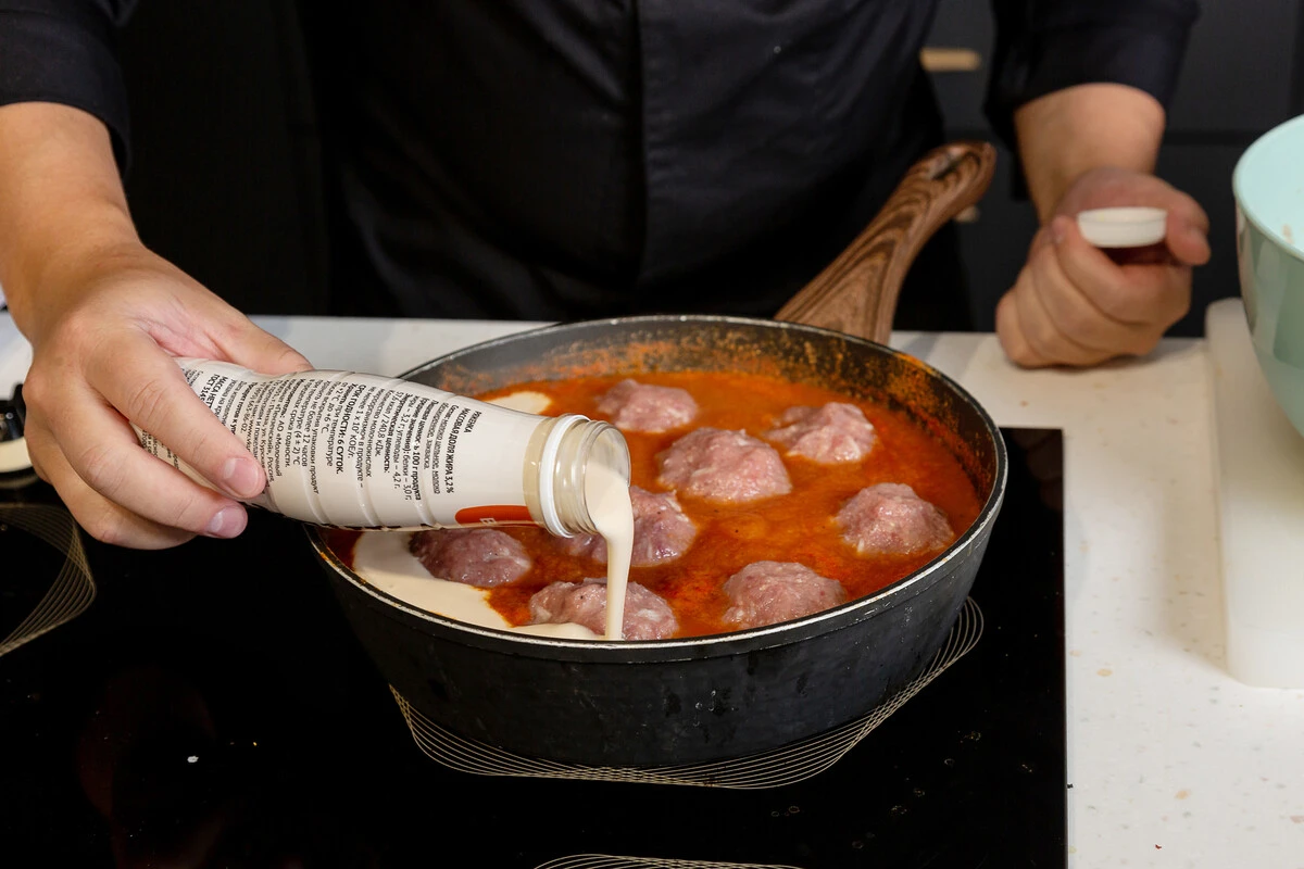 Выложите тефтели в подготовленный ранее соус. Налейте ряженку. Накройте крышкой и тушите примерно 20-30 минут. Через 10 минут после начала тушения аккуратно перемешайте. Готовые тефтели подавайте с подливкой.