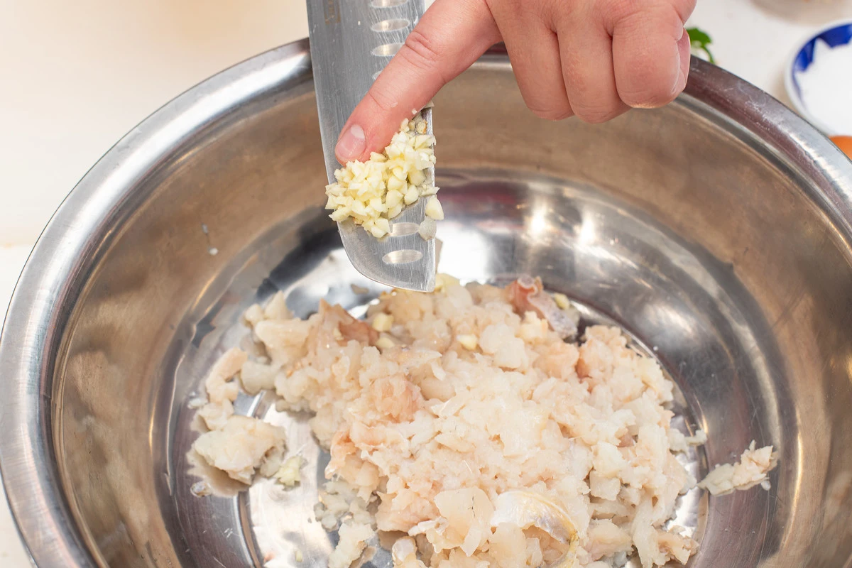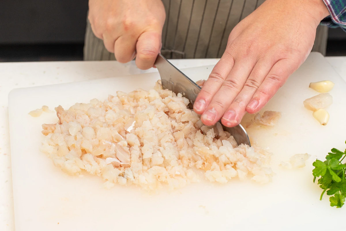 Разморозьте филе судака, снимите с кожи и порубите тяжёлым ножом. Выложите в миску.