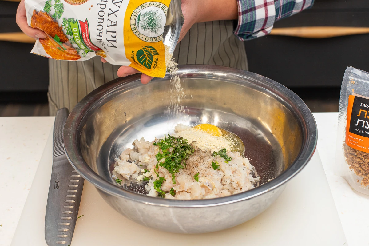 Добавьте яйцо, панировочные сухари. Посолите, поперчите и перемешайте до однородности.