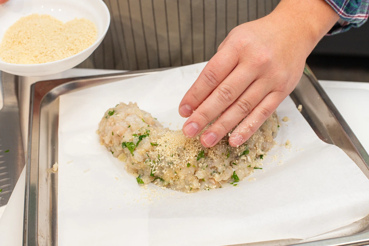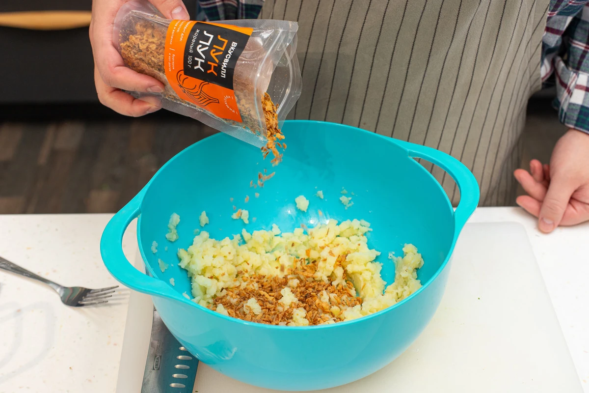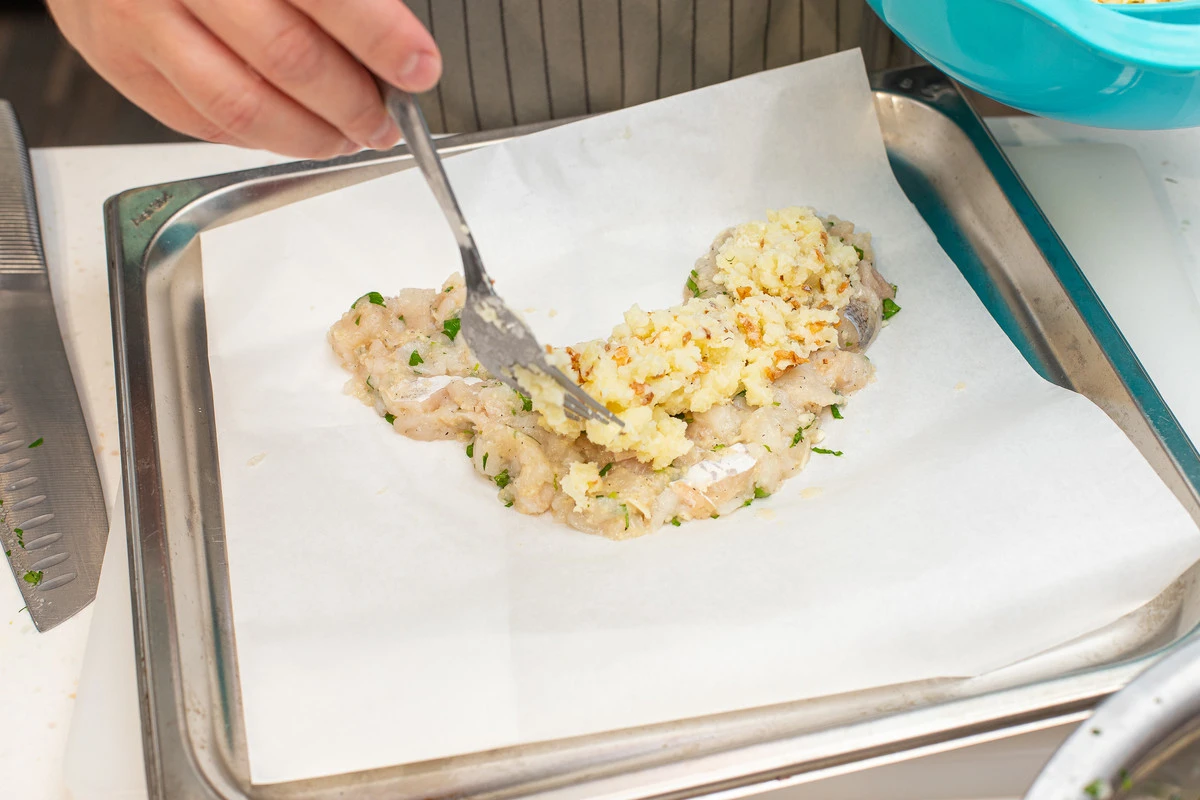 Застелите противень бумагой для выпечки. Выложите рыбный фарш в форме полумесяца, сверху — картошку. Накройте ещё одним слоем рыбного фарша. Залепите края. У вас должна получиться рыбная котлета в форме полумесяца с картофельной начинкой. Можете сделать одно большое тельное, как мы, или несколько поменьше.