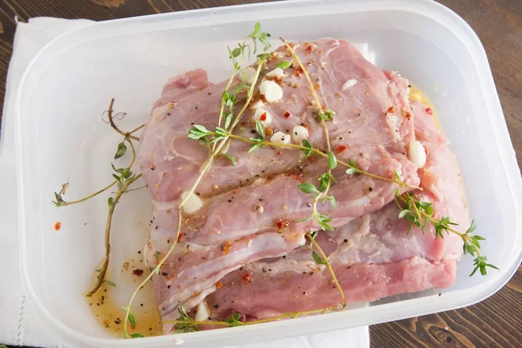 Маринад к такому мясу подойдет самый простой — взбейте вилкой масло с лимонным соком, добавьте мелко порубленный чеснок, перец, соль и листики тимьяна, натрите этой смесью мясо и оставьте на пару часов при комнатной температуре.