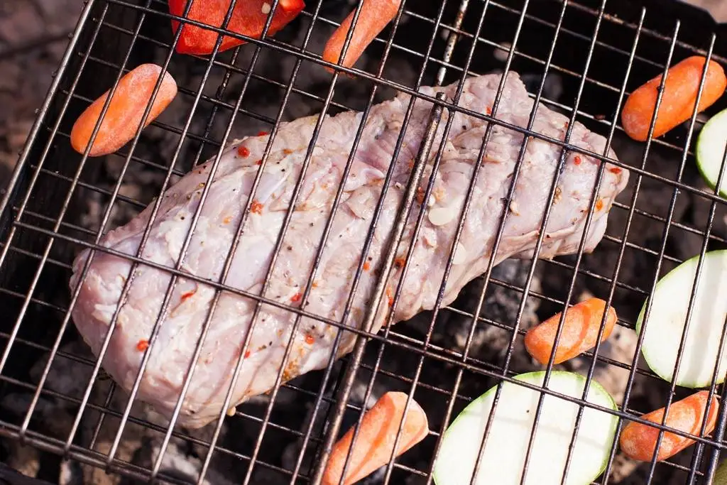 Стряхните излишки маринада и жарьте целым куском на решетке над углями до готовности. Подавайте с салатными листьями и свежими овощами.