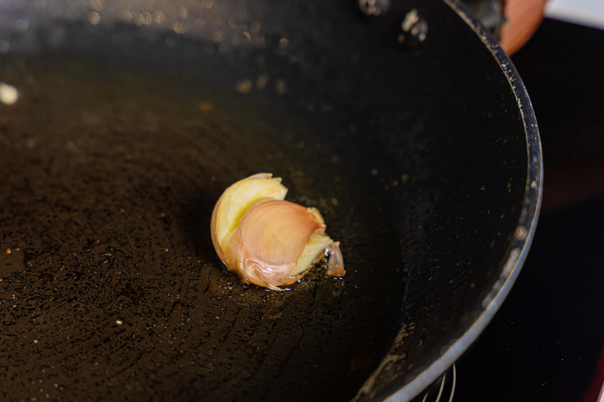 Разогрейте сковороду с маслом. Раздавите зубчик чеснока, не очищая, и выложите на сковороду. Чуть обжарьте.