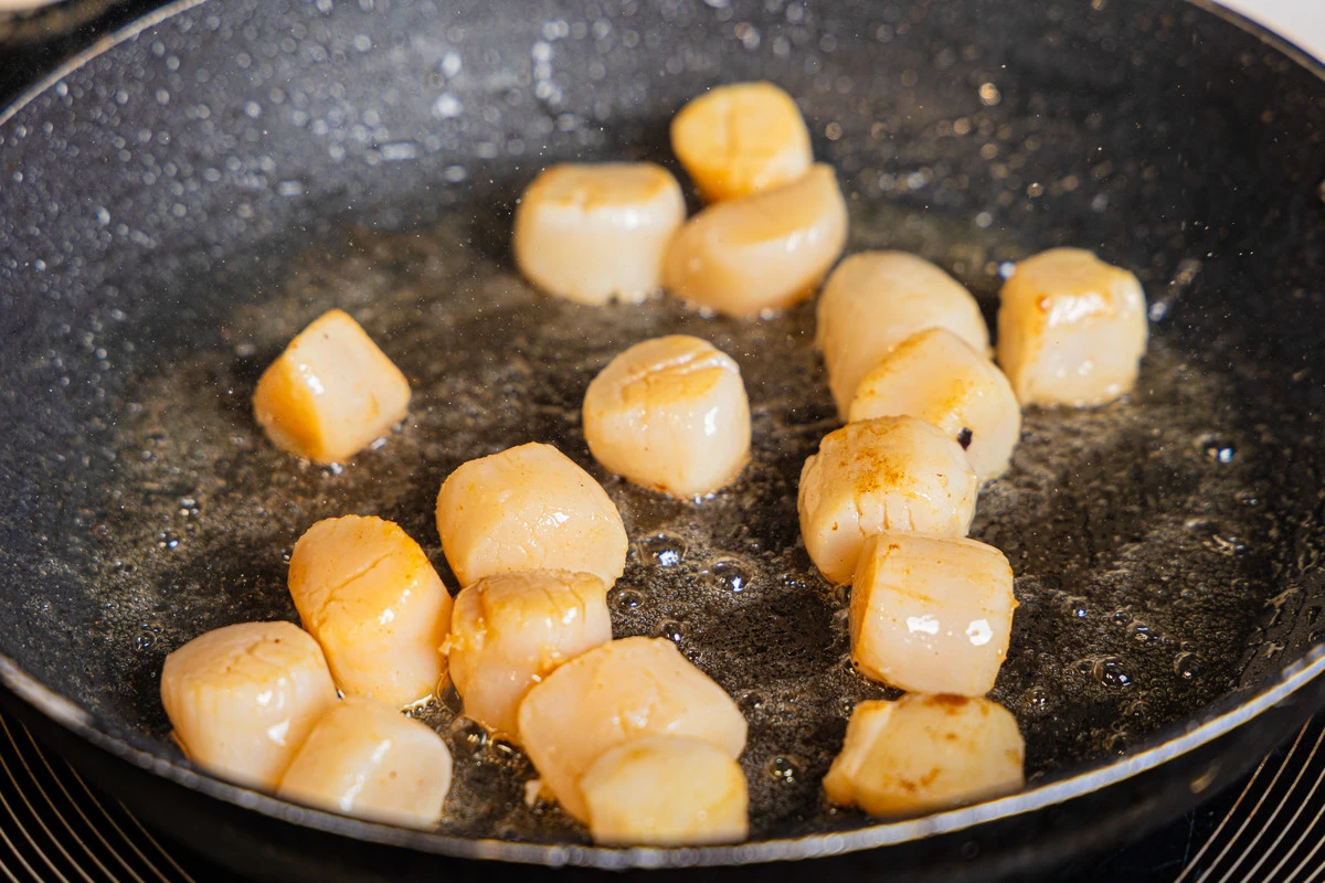 Уберите чеснок и выложите в сковороду гребешки. Обжаривайте, периодически помешивая, 2 минуты.