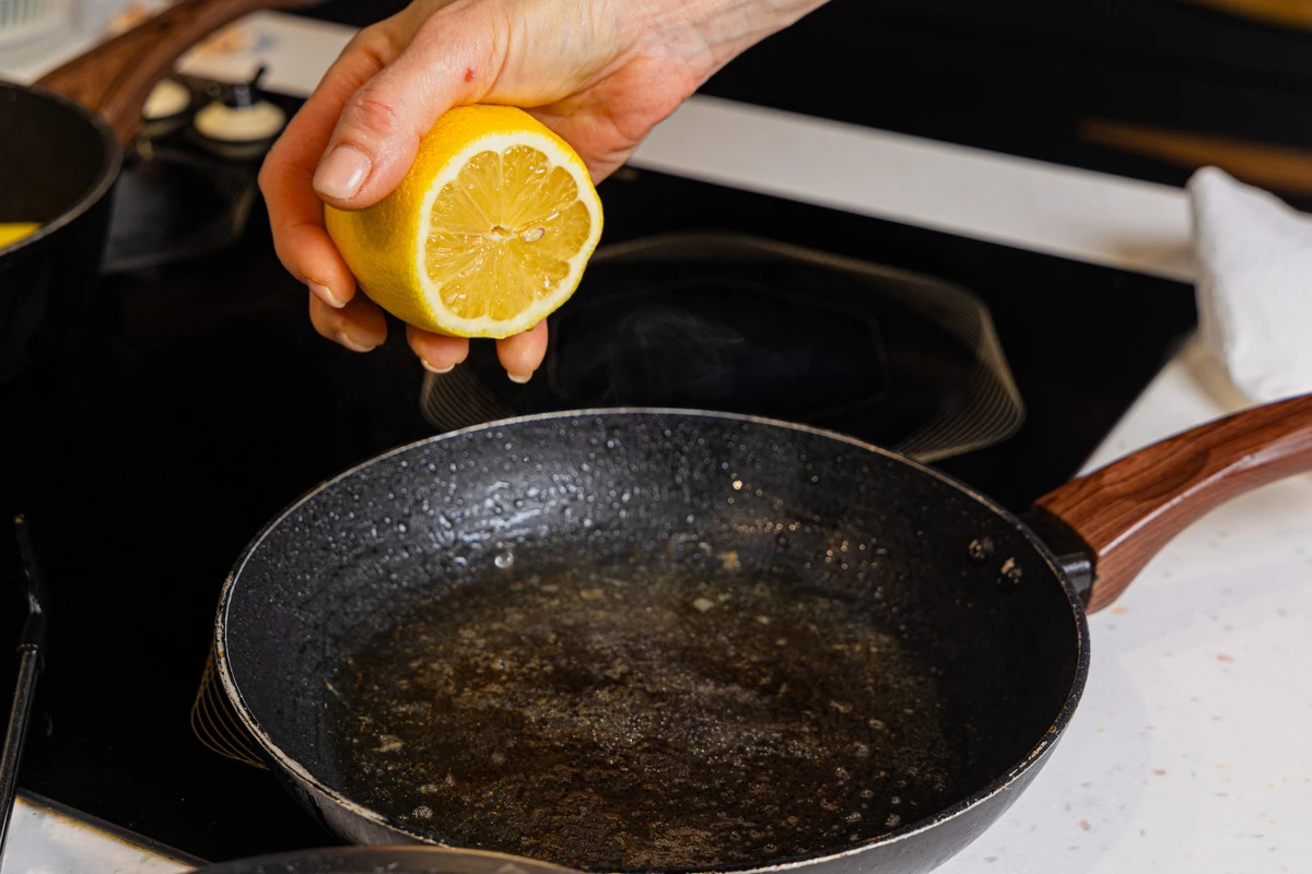 В жидкость, оставшуюся после жарки гребешков, влейте лимонный сок, перемешайте венчиком.