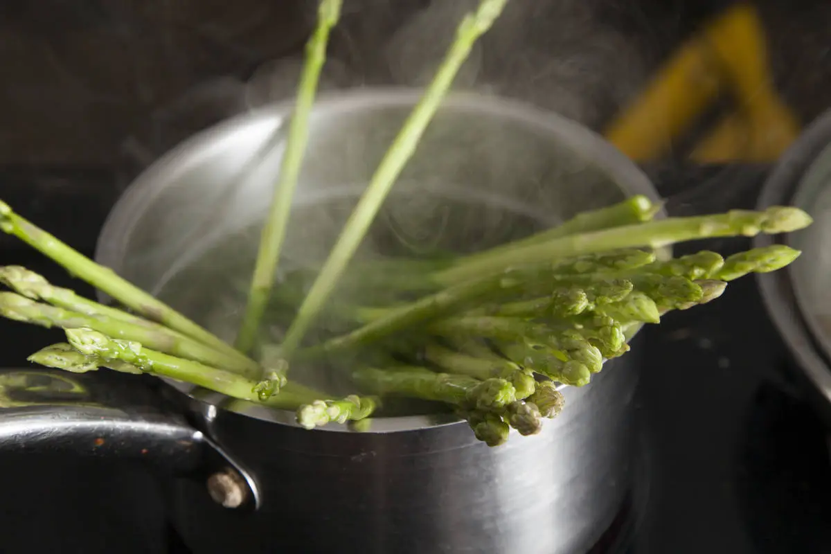 В сотейнике вскипятите воду и быстро бланшируйте спаржу, через полминуты переложите ее в холодную воду.