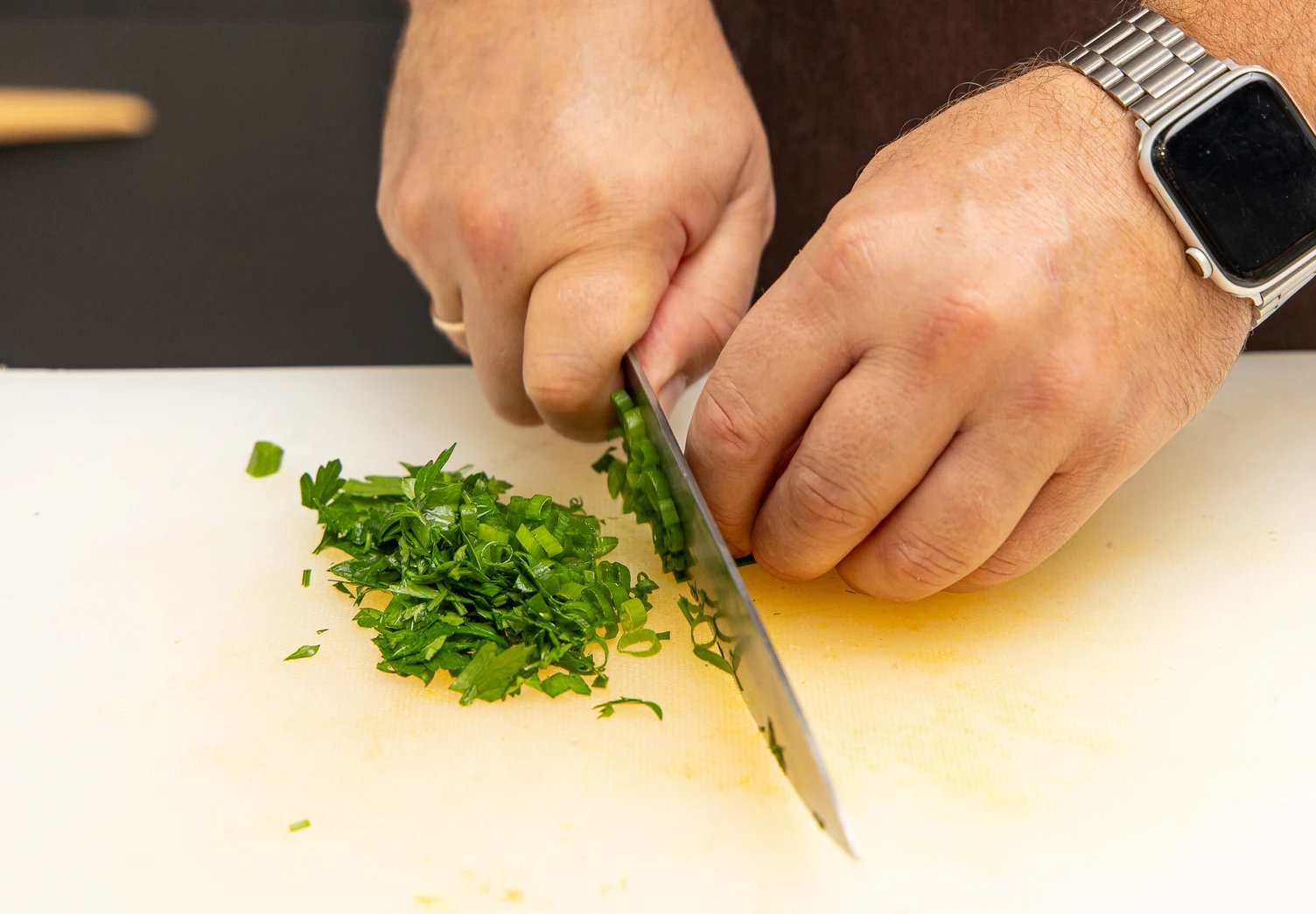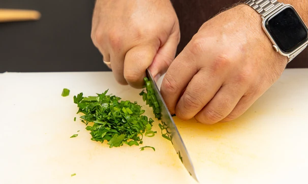 Нарежьте мелко зелёный лук и петрушку.