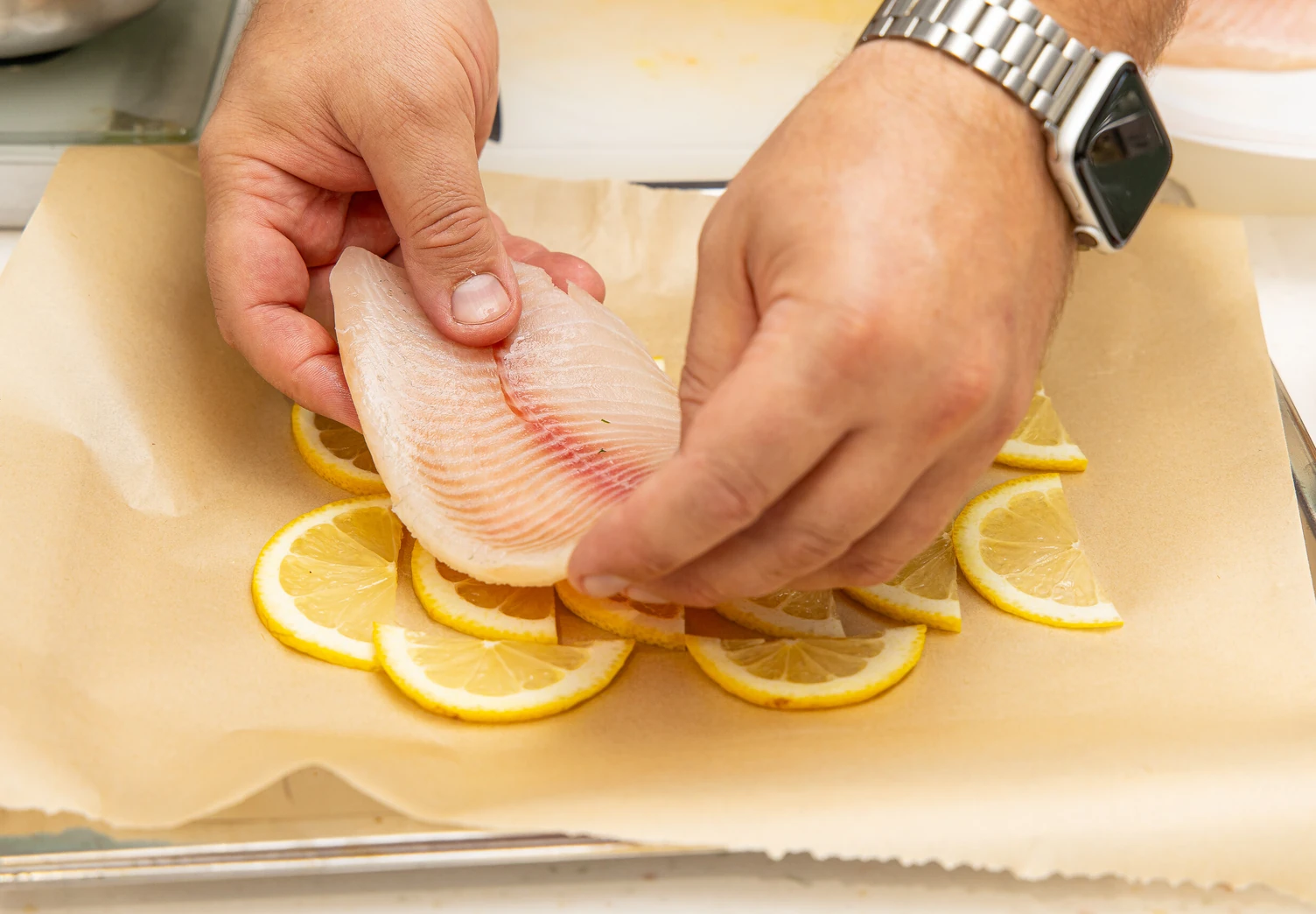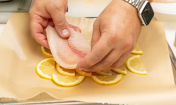 Застелите противень бумагой для выпечки. Выложите на противень колечки лимона, а на них — филе тилапии.