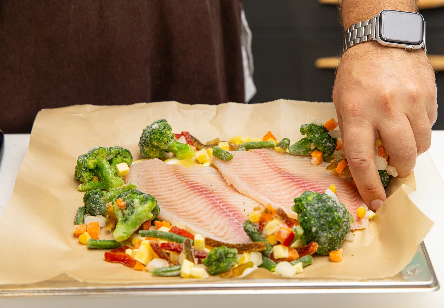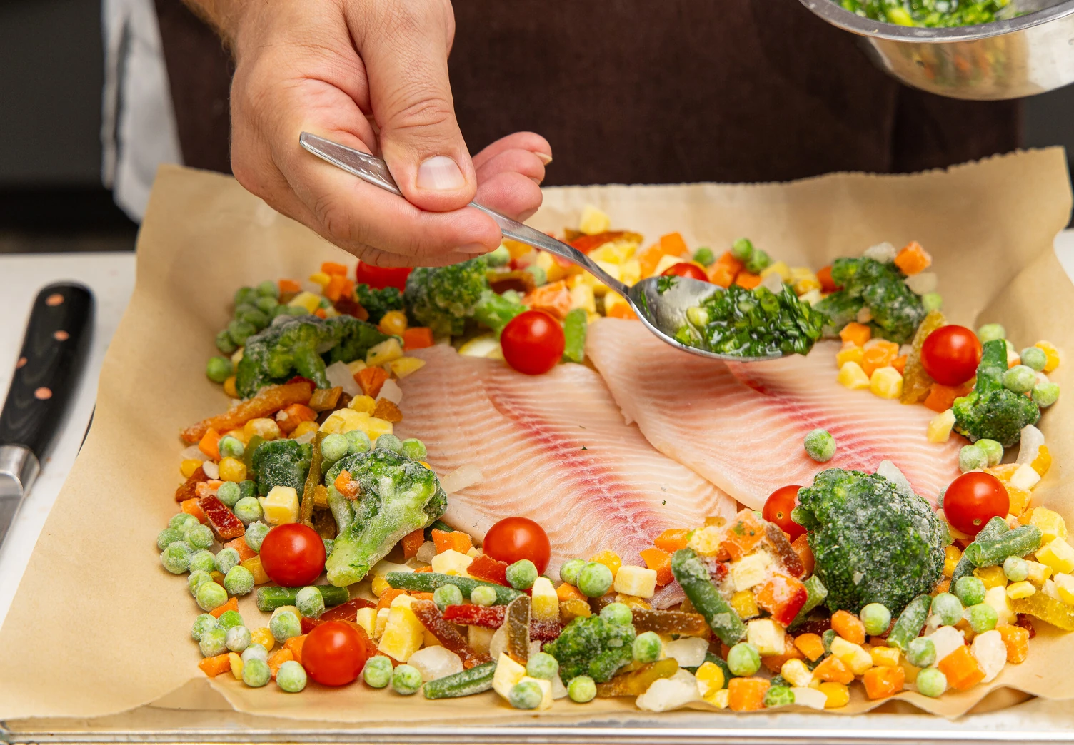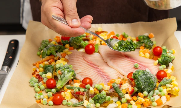 Выложите вокруг рыбы замороженные овощи, горошек и помидоры черри.