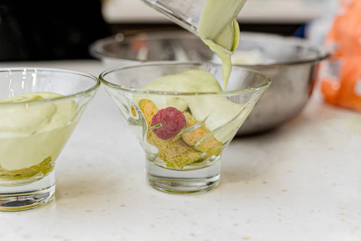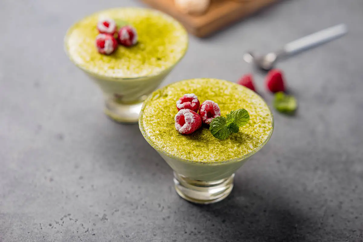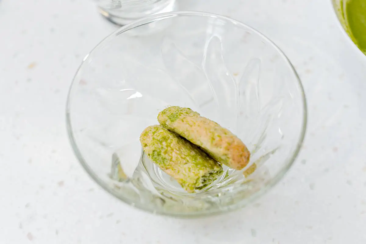 Подготовьте стаканчики или креманки. Окунайте печенье в чай матча и укладывайте на дно креманок. Добавьте в каждую несколько ягод малины.