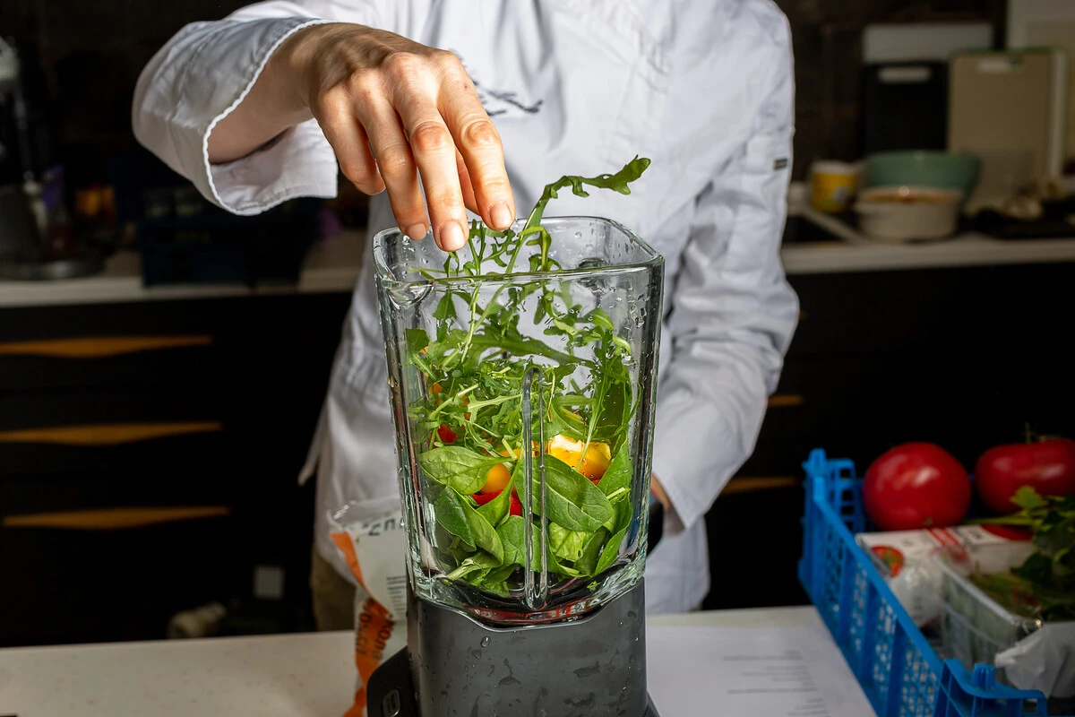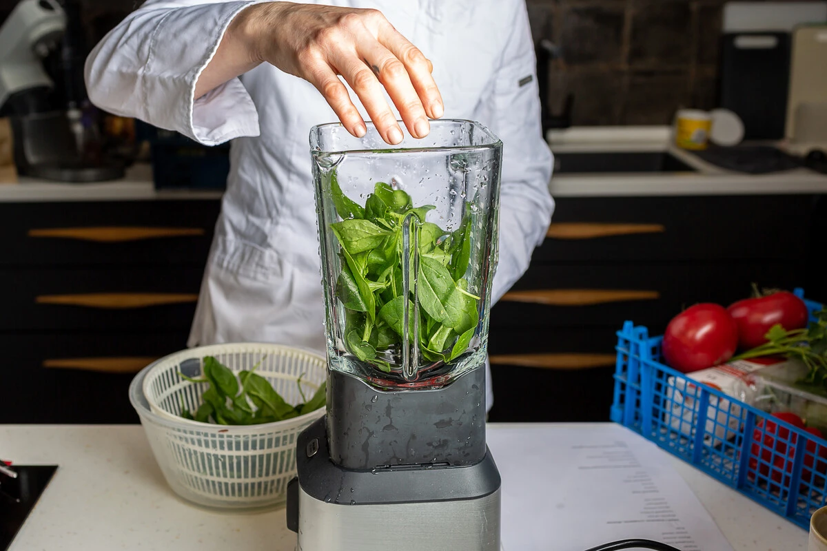 Помойте все овощи и зелень. Шпинат положите в чашу блендера.