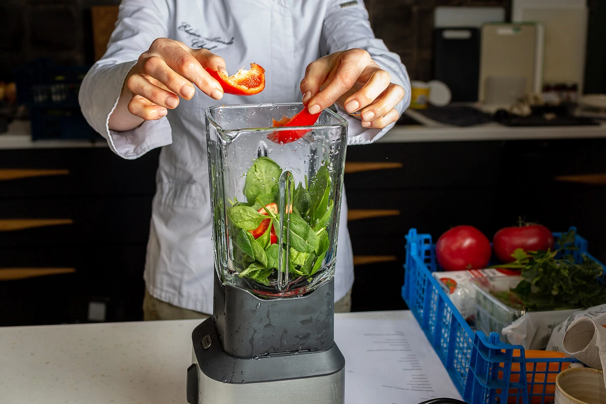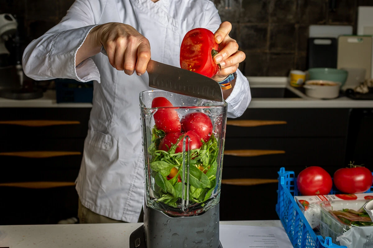 У томатов удалите плодоножку. Мякоть нарежьте дольками и также положите в блендер.