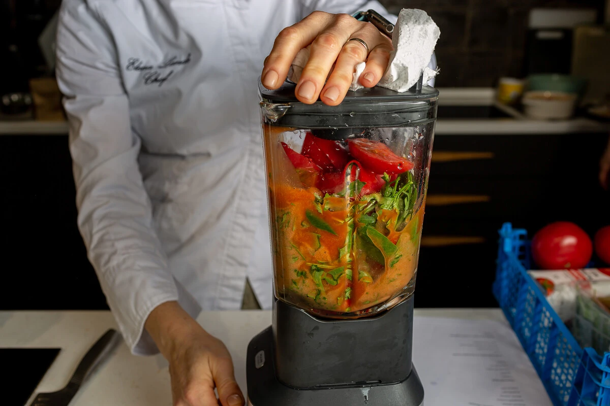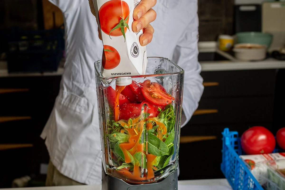 Налейте томатный сок и измельчите все ингредиенты блендером до однородности. Если будет очень густо, можно добавить воду — 0,5 л или по вкусу до желаемой консистенции.