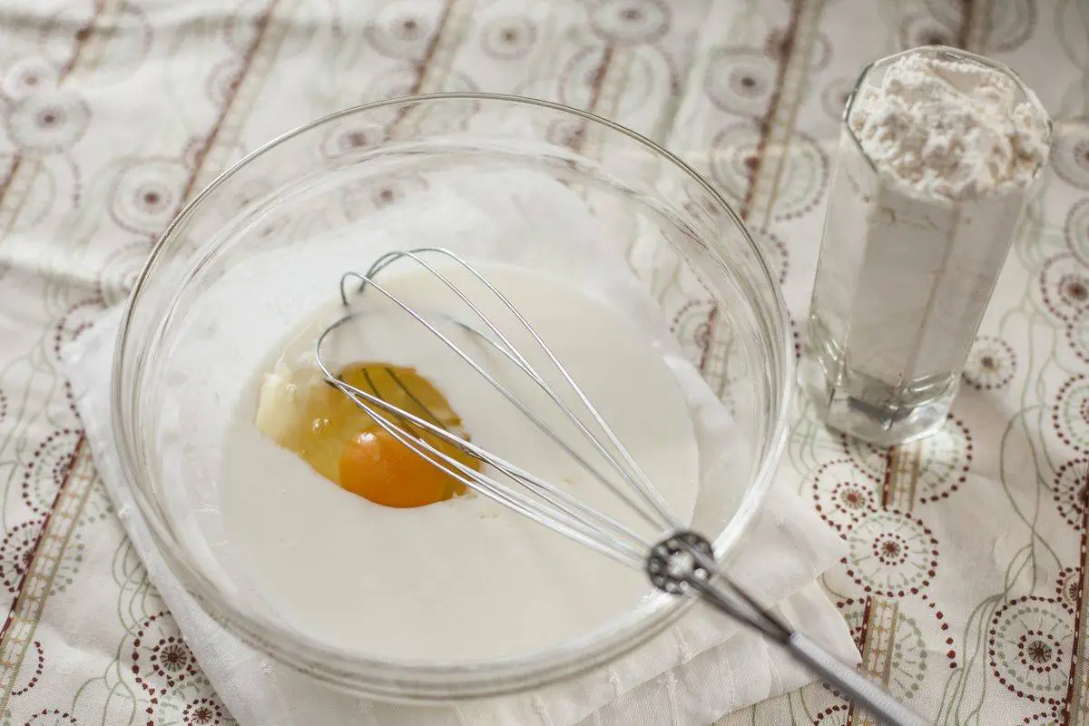 Смешайте кефир, муку, яйцо, соль и сахар, слегка взбейте венчиком.