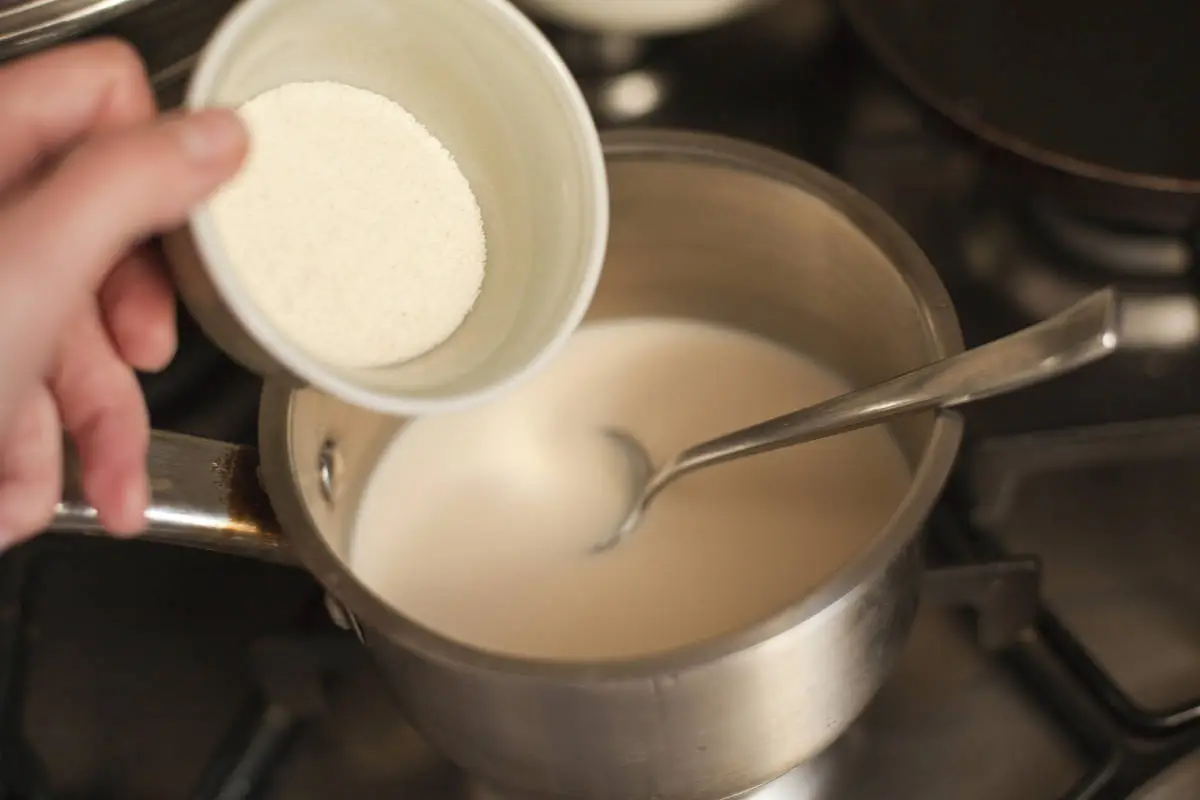 В небольшой кастрюльке доводим молоко почти до кипения и всыпаем манку с сахаром и солью тонкой струйкой, постоянно помешивая.