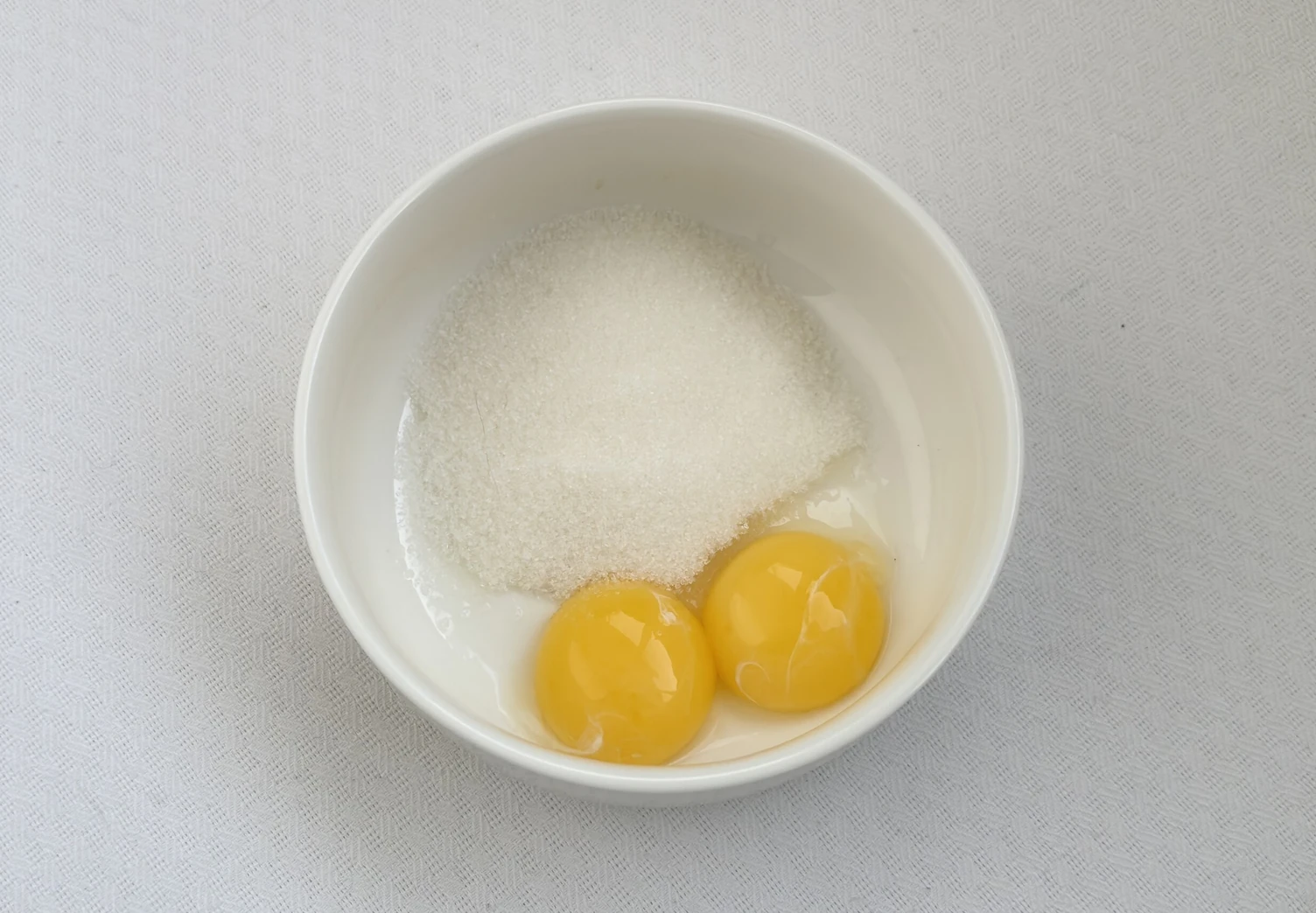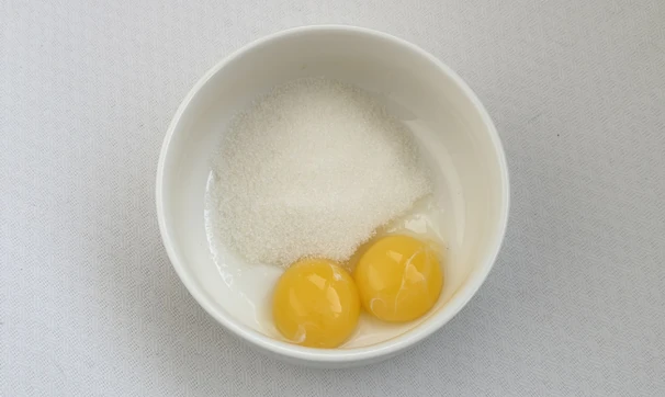 Отделите желтки от белков. Белки поместите в сухую чистую миску, а к желткам сразу добавьте сахар и перемешайте до однородности.