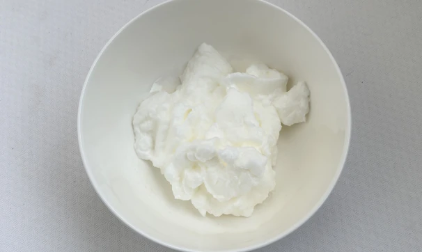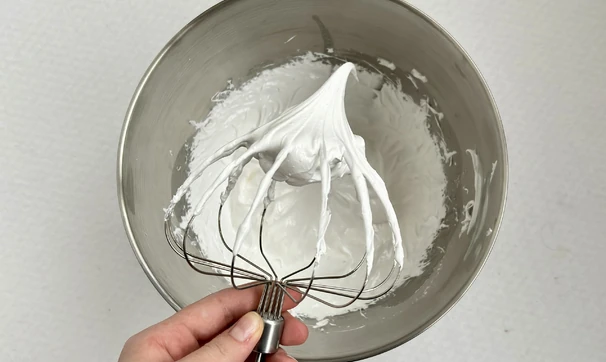 Перед подачей приготовьте меренгу. В чистой сухой миске взбейте белки с сахарной пудрой до устойчивых пиков.