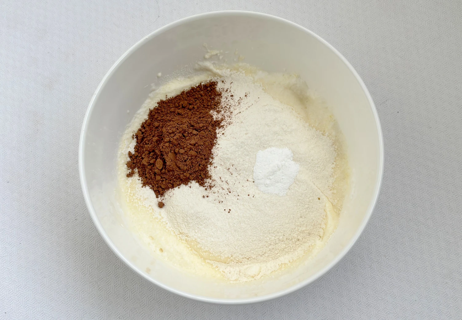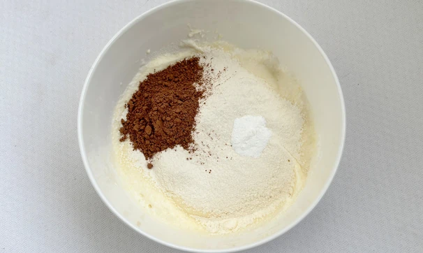 К взбитым белкам аккуратно добавьте желтковую смесь, какао, разрыхлитель и муку. Осторожно перемешайте лопаткой снизу вверх, чтобы масса не опала.