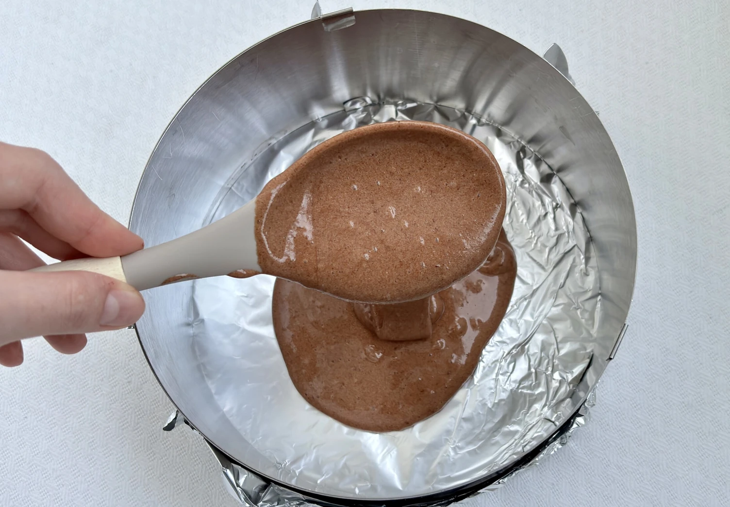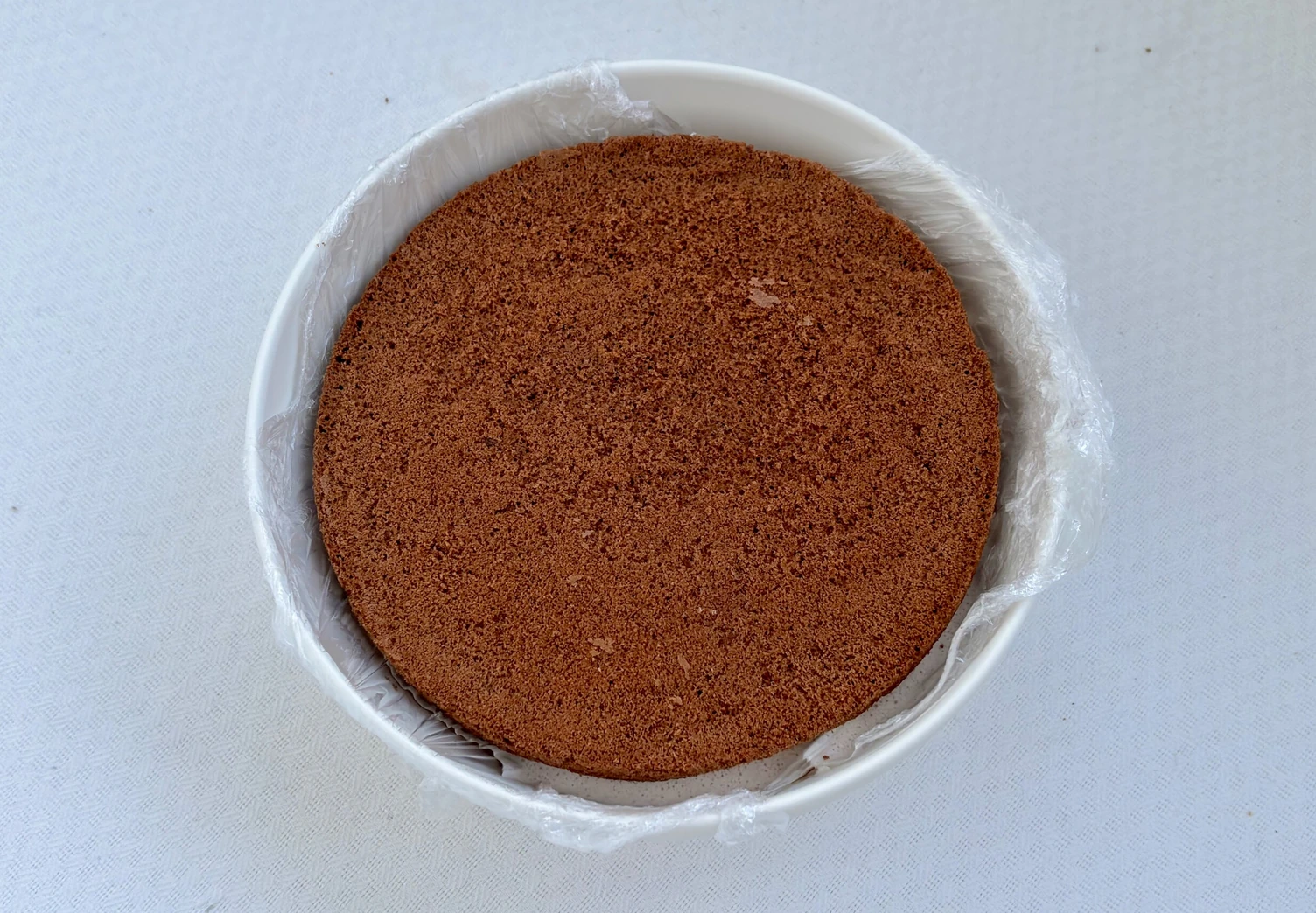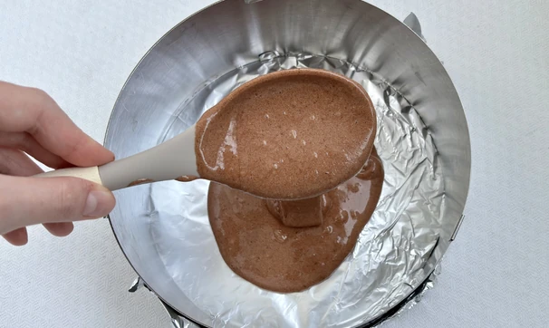 Готовое тесто перелейте в форму, застеленную фольгой, и выпекайте бисквит в разогретой до 180°C духовке 20–25 минут.