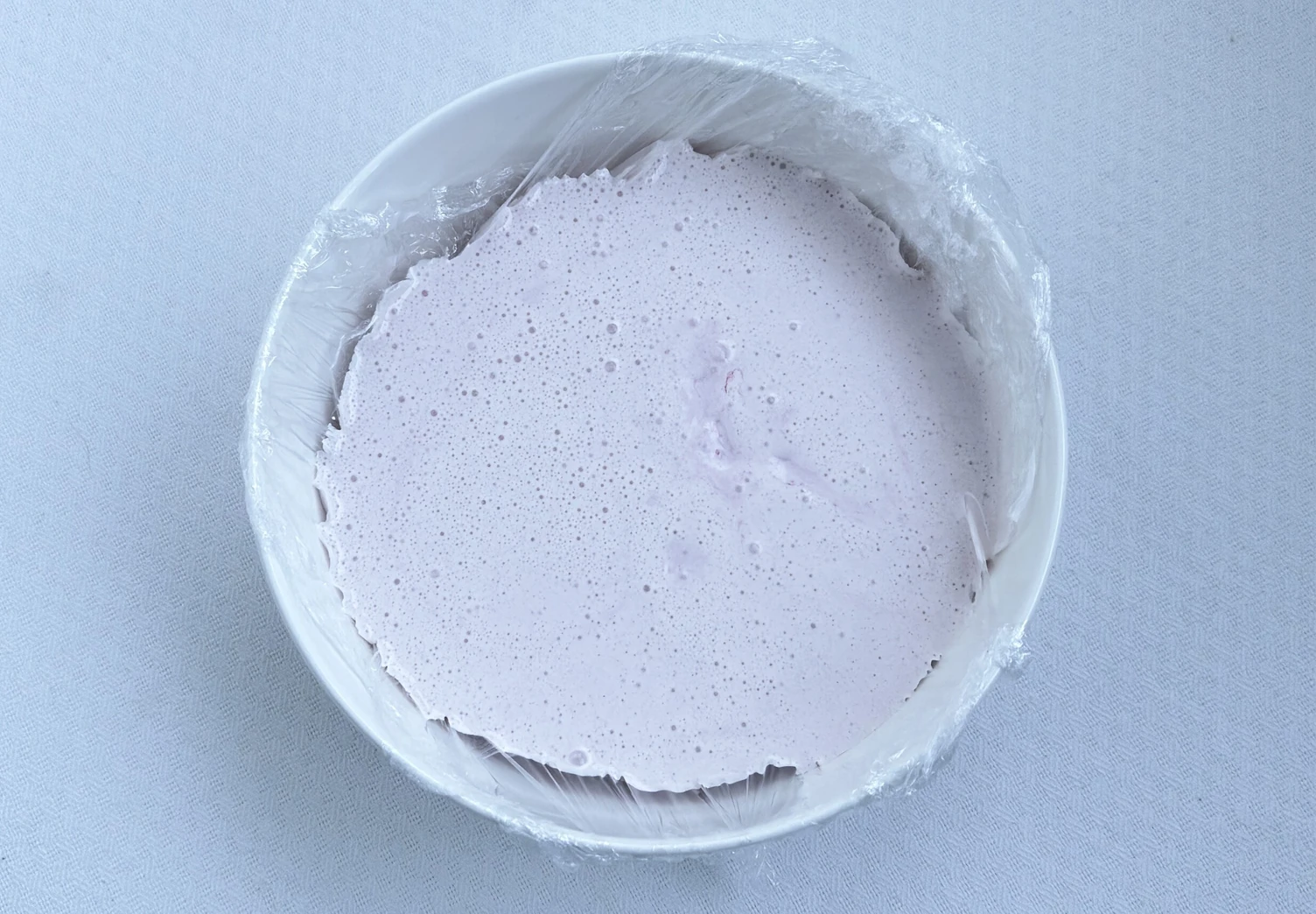 Добавьте клубничное пюре и перемешайте. Готовую массу перелейте в миску, застеленную пищевой пленкой, и уберите в морозилку на несколько часов до полного застывания.