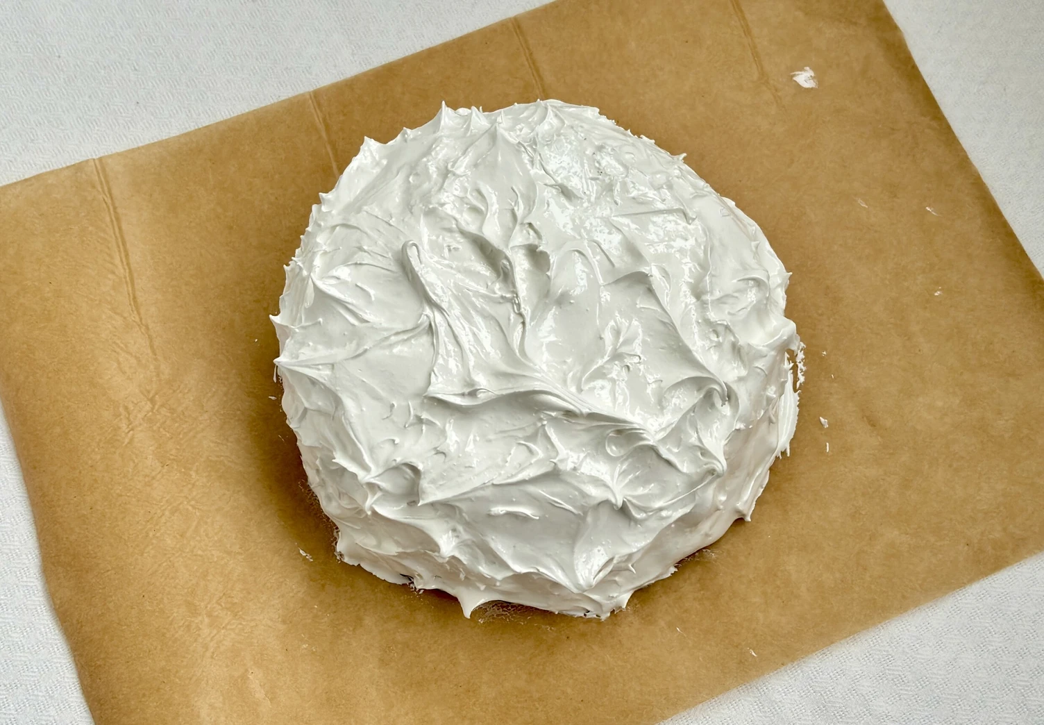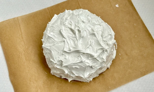Переверните застывший торт на лист пергамента, покройте всю поверхность меренгой, создавая рельеф «волн» ложкой.