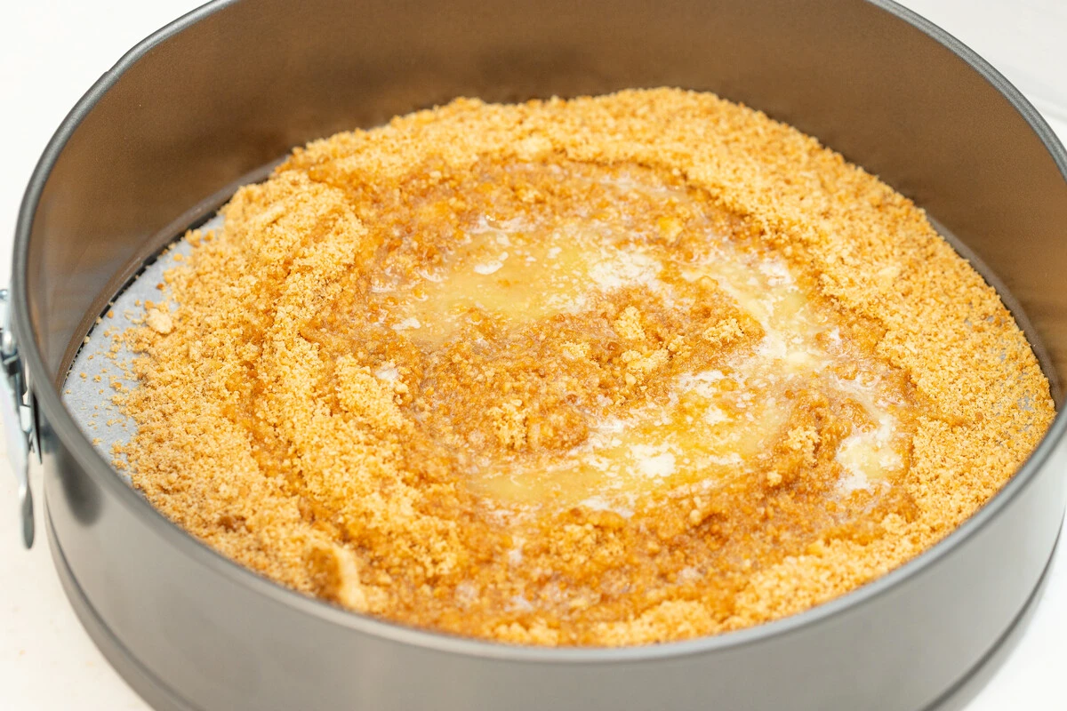 Измельчите в блендере 200 г печенья в мелкую крошку. Сливочное масло растопите и смешайте с печеньем.