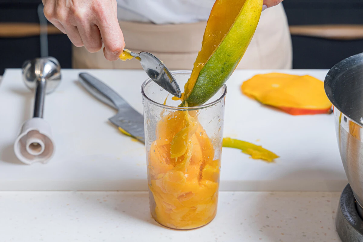 Манго вымойте, обсушите и почистите. Отделите мякоть от косточки, всего нам понадобится 500 г мякоти. Разделите мякоть на две равные части, одну часть нарежьте кусочками и измельчите блендером в пюре. Если у вас два манго, одно из них помягче, другое покрепче, для пюре используйте более мягкие кусочки. Оставшееся манго нарежьте кусочками — мелкими или среднего размера, как вам нравится.