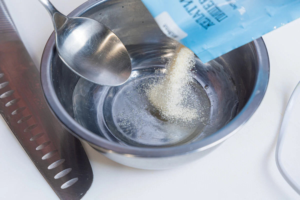 Высыпьте 20 г желатина в 100 мл горячей воды и тщательно размешайте венчиком до полного растворения желатина.