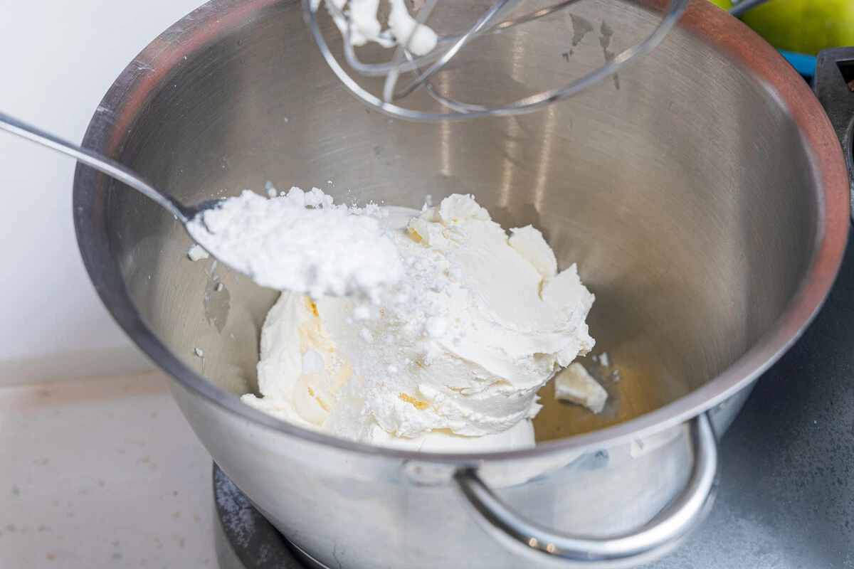 Выложите кремчиз в чашу миксера, добавьте 200 г сахарной пудры и смешайте до однородности. Добавьте пюре манго и снова перемешайте.