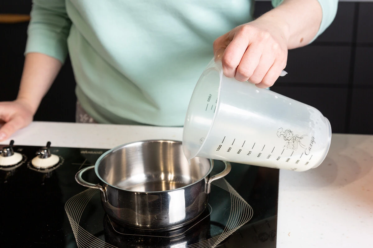 В небольшой кастрюльке нагрейте молоко и сливочное масло, пока масло не расплавится. Смесь должна быть достаточно тёплой, но не горячей.