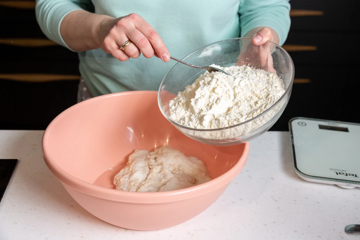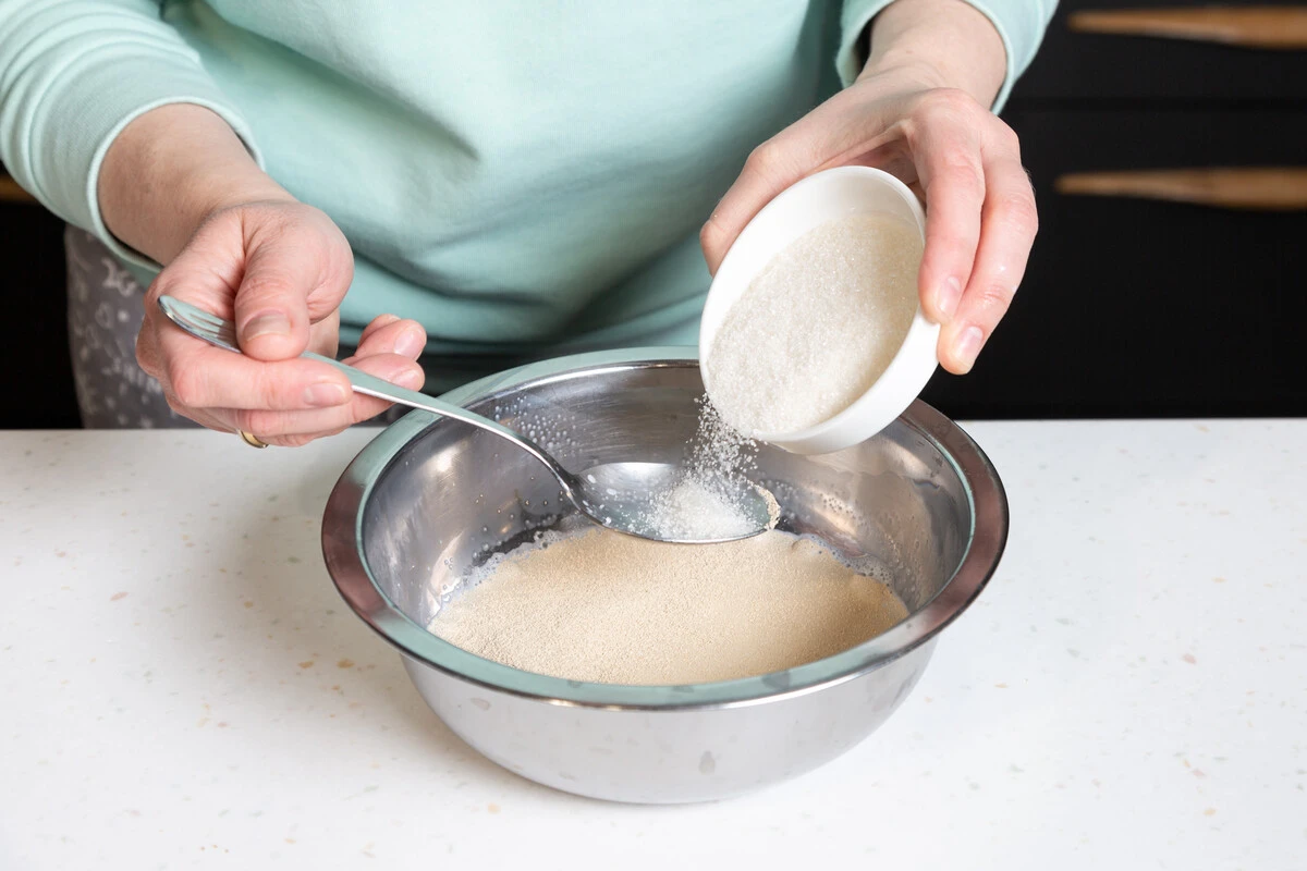 Добавьте к масляно-молочной смеси дрожжи, сахар, соль и полстакана просеянной муки. Поставьте получившуюся опару в тёплое место на 5–10 минут.