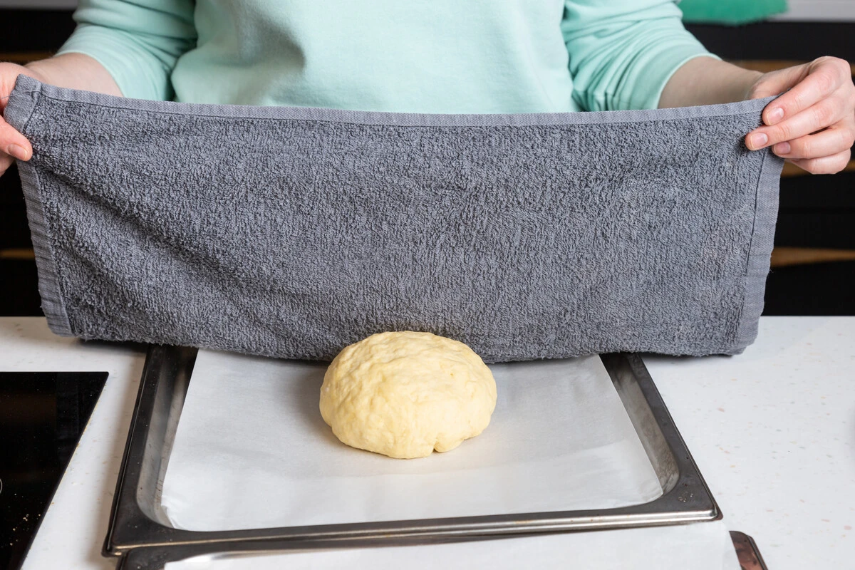 Из получившегося теста сформируйте большую булку, накройте и оставьте подниматься примерно на 40 минут.