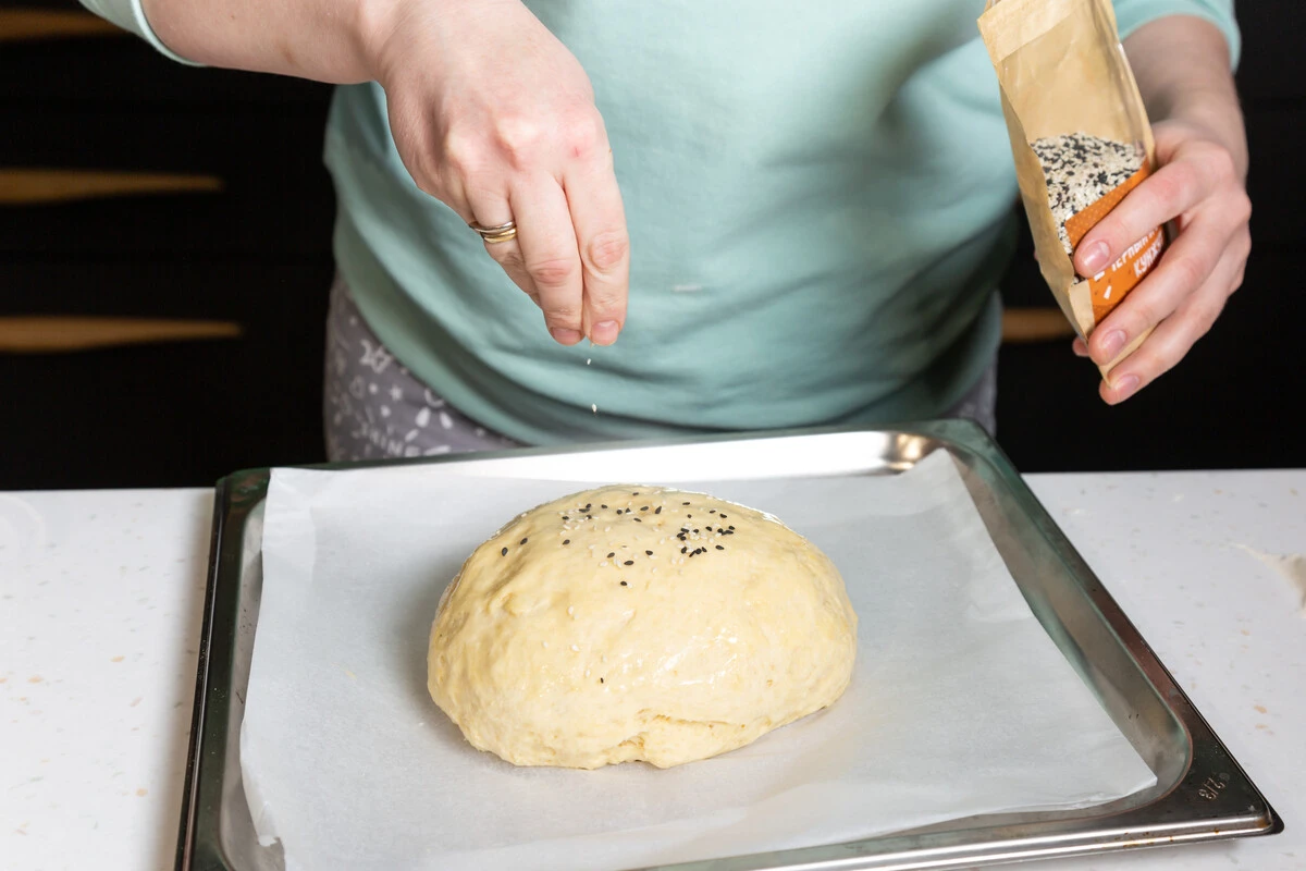 Духовку разогрейте до 200 градусов. Смажьте булку слегка взбитым яйцом, посыпьте кунжутом и выпекайте в течение 15–20 минут, пока не подрумянится.