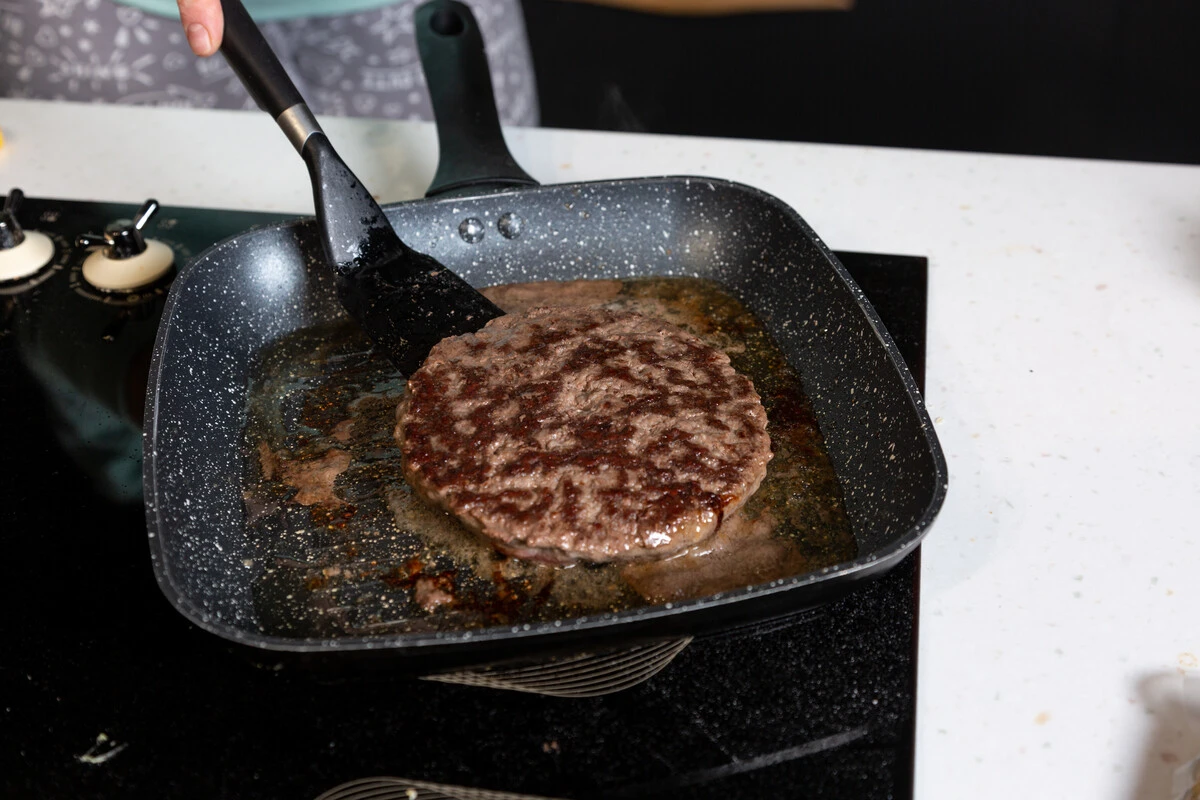 Фарш посолите, поперчите и разделите на 2 части. Сформируйте из каждой большую котлету и жарьте на сковородке или гриле до готовности.