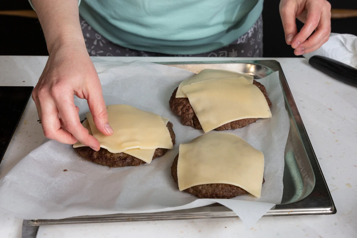 На готовые котлеты выложите по 2–3 ломтика сыра и запеките в духовке при 200 градусах в течение 2–3 минут, пока сыр не начнёт плавиться.
