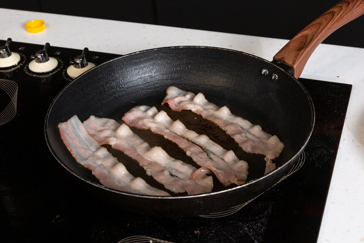 Бекон обжарьте, помидор порежьте тонкими кружочками, салат разберите на листья.