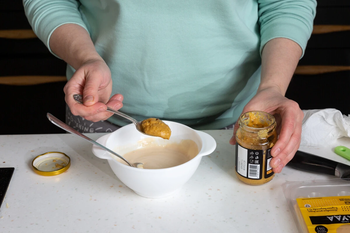 Для соуса мы смешали 3 ст. л. майонеза, 1 ст. л. соевого соуса и 1 ч. л. дижонской горчицы. Можно также использовать кетчуп, барбекю или любой другой соус.