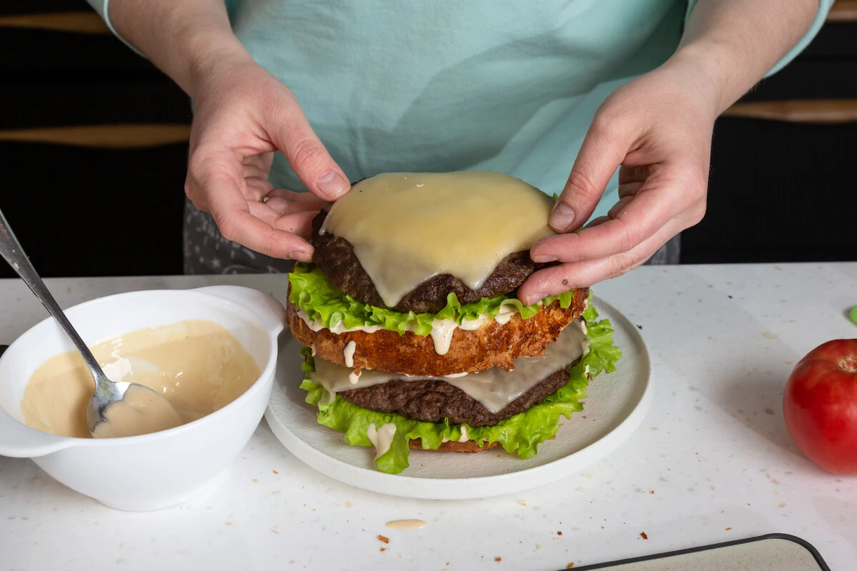 Если хотите удивить своих гостей, приготовьте этот гигантский бургер из вселенной Sims. Для котлет можно использовать куриный фарш, а в начинку добавить маринованные огурчики и красный лук — получится ещё сочнее и пикантнее.
