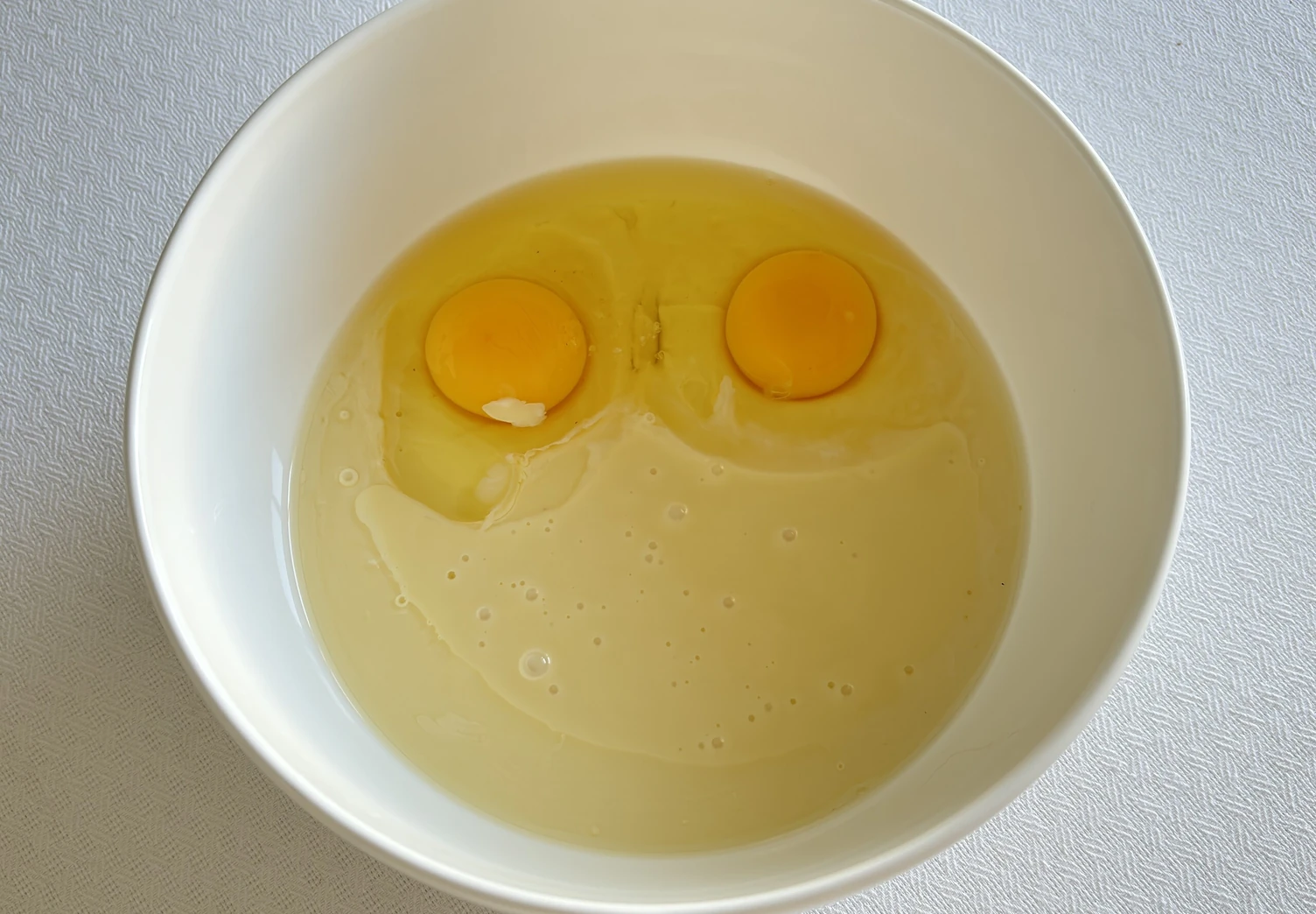 В миску налейте сгущённое молоко, разбейте яйца и добавьте соль. Тщательно всё перемешайте.
