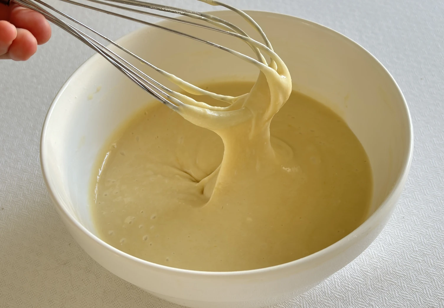 В отдельной ёмкости смешайте разрыхлитель и муку, затем добавьте их в тесто. Перемешайте тесто венчиком до однородности.