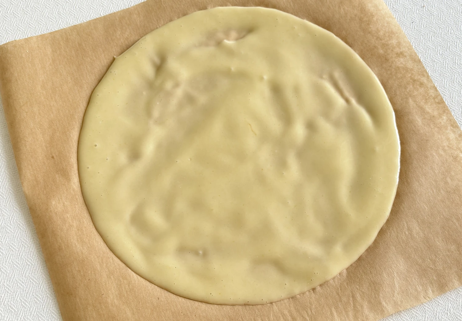 Размажьте 2 столовые ложки теста по пергаменту, рисуя круг. Для удобства можно заранее слегка нарисовать окружность карандашом на пергаменте. Повторите это действие со всем тестом.