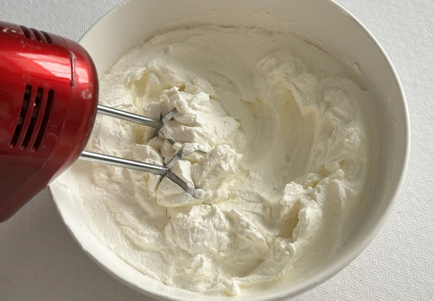 Для приготовления крема в миску положите творожный сливочный сыр, добавьте холодные сливки и сахарную пудру. Сначала перемешайте массу лопаткой, а затем взбивайте на высокой скорости миксера 4–5 минут.