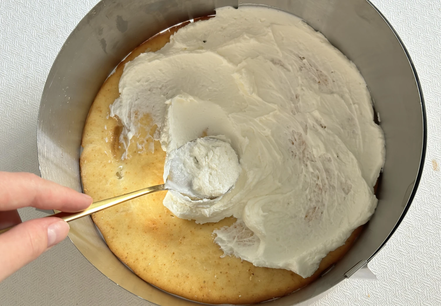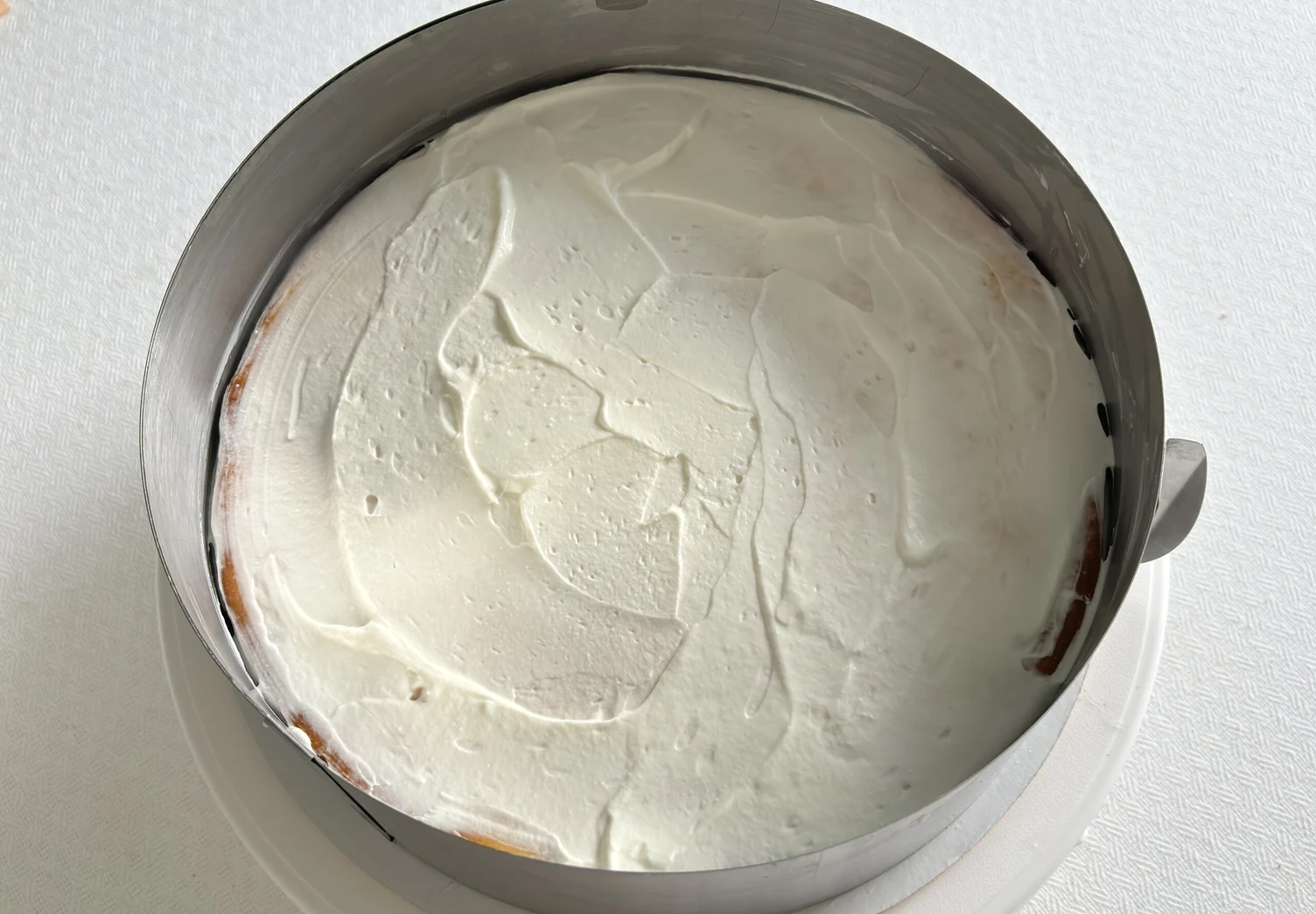Соберите торт в кольце, чередуя коржи и крем. Оставьте немного крема для финального выравнивания.