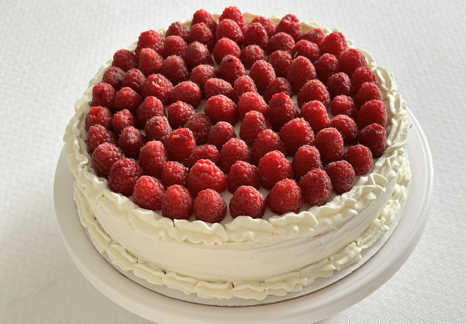 После стабилизации достаньте торт из холодильника и выровняйте его оставшимся кремом. По краю торта сделайте рюши и выложите малину по всей поверхности.